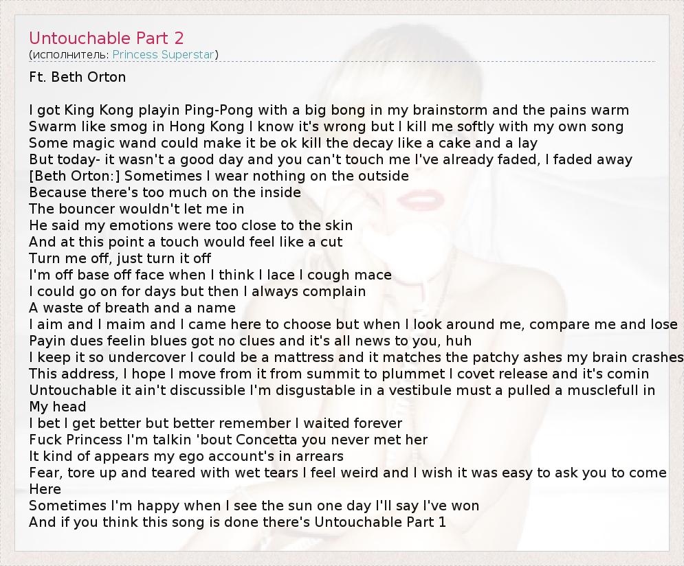 Ft. Beth Orton I got King Kong playin Ping-Pong with a big bong in my brainstorm and the pains warm Swarm like smog in Hong Kong I know it's wrong but I kill me softly with my own song Some magic wand could make it be ok kill the decay like a cake and a lay But today- it wasn't a good day and you can't touch me I've already faded, I faded away [Beth Orton:] Sometimes I wear nothing on the outside Because there's too much on the inside The bouncer wouldn't let me in He said my emotions were too close to the skin And at this point a touch would feel like a cut Turn me off, just turn it off I'm off base off face when I think I lace I cough mace I could go on for days but then I always complain A waste of breath and a name I aim and I maim and I came here to choose but when I look around me, compare me and lose Payin dues feelin blues got no clues and it's all news to you, huh I keep it so undercover I could be a mattress and it matches the patchy ashes my brain crashes This address, I hope I move from it from summit to plummet I covet release and it's comin Untouchable it ain't discussible I'm disgustable in a vestibule must a pulled a musclefull in My head I bet I get better but better remember I waited forever Fuck Princess I'm talkin 'bout Concetta you never met her It kind of appears my ego account's in arrears Fear, tore up and teared with wet tears I feel weird and I wish it was easy to ask you to come Here Sometimes I'm happy when I see the sun one day I'll say I've won And if you think this song is done there's Untouchable Part 1