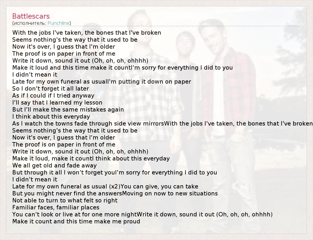 With the jobs I've taken, the bones that I've broken Seems nothing's the way that it used to be Now it's over, I guess that I'm older The proof is on paper in front of me Write it down, sound it out (Oh, oh, oh, ohhhh) Make it loud and this time make it countI'm sorry for everything I did to you I didn't mean it Late for my own funeral as usualI'm putting it down on paper So I don't forget it all later As if I could if I tried anyway I'll say that I learned my lesson But I'll make the same mistakes again I think about this everyday As I watch the towns fade through side view mirrorsWith the jobs I've taken, the bones that I've broken Seems nothing's the way that it used to be Now it's over, I guess that I'm older The proof is on paper in front of me Write it down, sound it out (Oh, oh, oh, ohhhh) Make it loud, make it countI think about this everyday We all get old and fade away But through it all I won't forget youI'm sorry for everything I did to you I didn't mean it Late for my own funeral as usual (x2)You can give, you can take But you might never find the answersMoving on now to new situations Not able to turn to what felt so right Familiar faces, familiar places You can't look or live at for one more nightWrite it down, sound it out (Oh, oh, oh, ohhhh) Make it count and this time make me proud