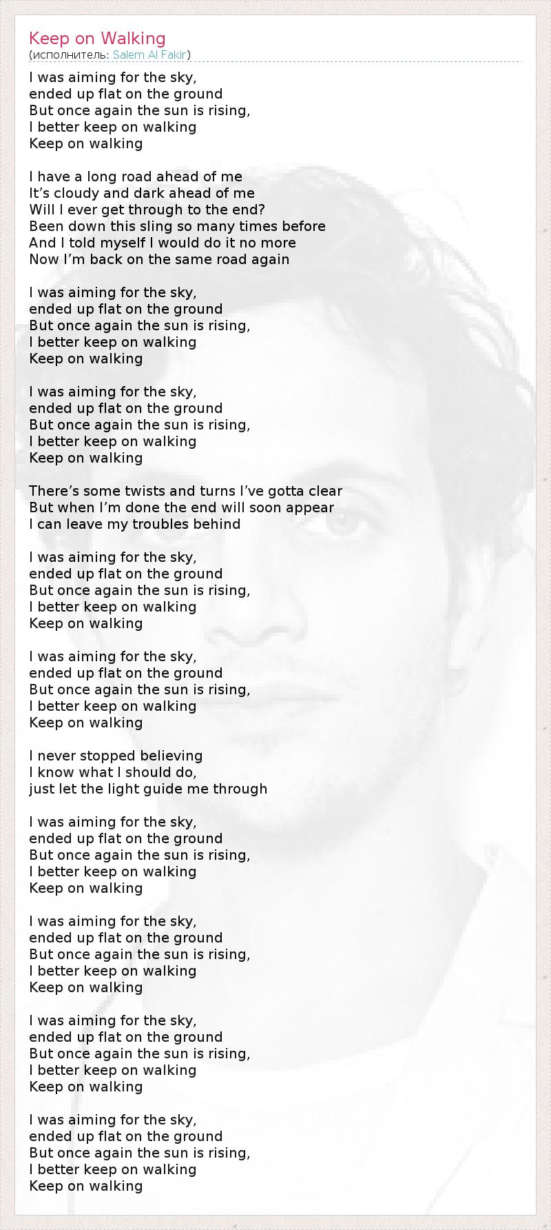 I was aiming for the sky, ended up flat on the ground But once again the sun is rising, I better keep on walking Keep on walking I have a long road ahead of me It’s cloudy and dark ahead of me Will I ever get through to the end? Been down this sling so many times before And I told myself I would do it no more Now I’m back on the same road again I was aiming for the sky, ended up flat on the ground But once again the sun is rising, I better keep on walking Keep on walking I was aiming for the sky, ended up flat on the ground But once again the sun is rising, I better keep on walking Keep on walking There’s some twists and turns I’ve gotta clear But when I’m done the end will soon appear I can leave my troubles behind I was aiming for the sky, ended up flat on the ground But once again the sun is rising, I better keep on walking Keep on walking I was aiming for the sky, ended up flat on the ground But once again the sun is rising, I better keep on walking Keep on walking I never stopped believing I know what I should do, just let the light guide me through I was aiming for the sky, ended up flat on the ground But once again the sun is rising, I better keep on walking Keep on walking I was aiming for the sky, ended up flat on the ground But once again the sun is rising, I better keep on walking Keep on walking I was aiming for the sky, ended up flat on the ground But once again the sun is rising, I better keep on walking Keep on walking I was aiming for the sky, ended up flat on the ground But once again the sun is rising, I better keep on walking Keep on walking