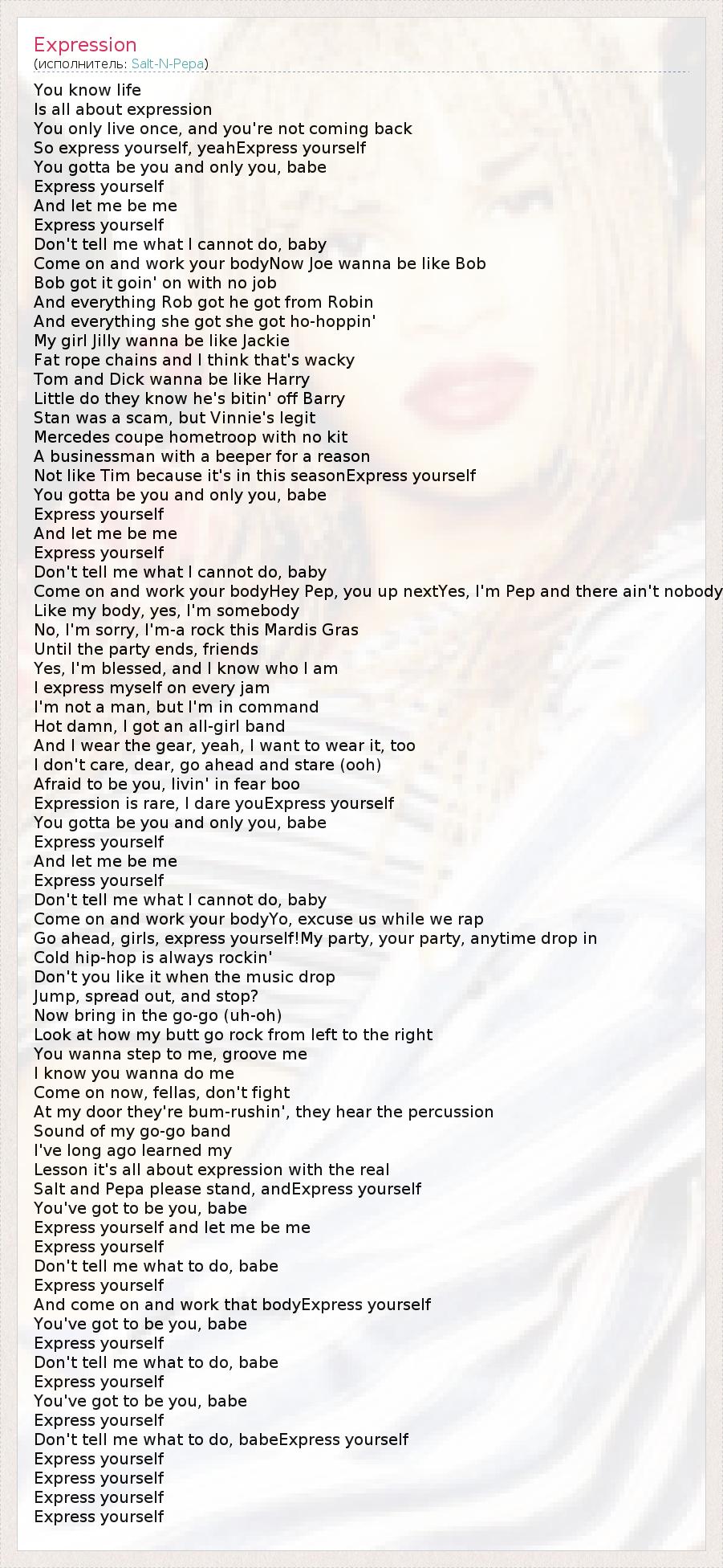Это интересно:Напомню сразу, что SALT’N’PEPA — это женское трио из Америки.Cheryl ‘Salt’ James родом из нью–йоркского района Бруклин. Sandy‘Pepa’ Denton (р. 9.10.1969 г.) родилась на Ямайке, но росла также в Нью–Йорке (район Куинс). Обе семьи были многодетными.Дамочки познакомились в колледже, затем окончания которого могли начинать воспитателями в детском саду. Обе стали подрабатывать в супермаркете под названием... продолжение