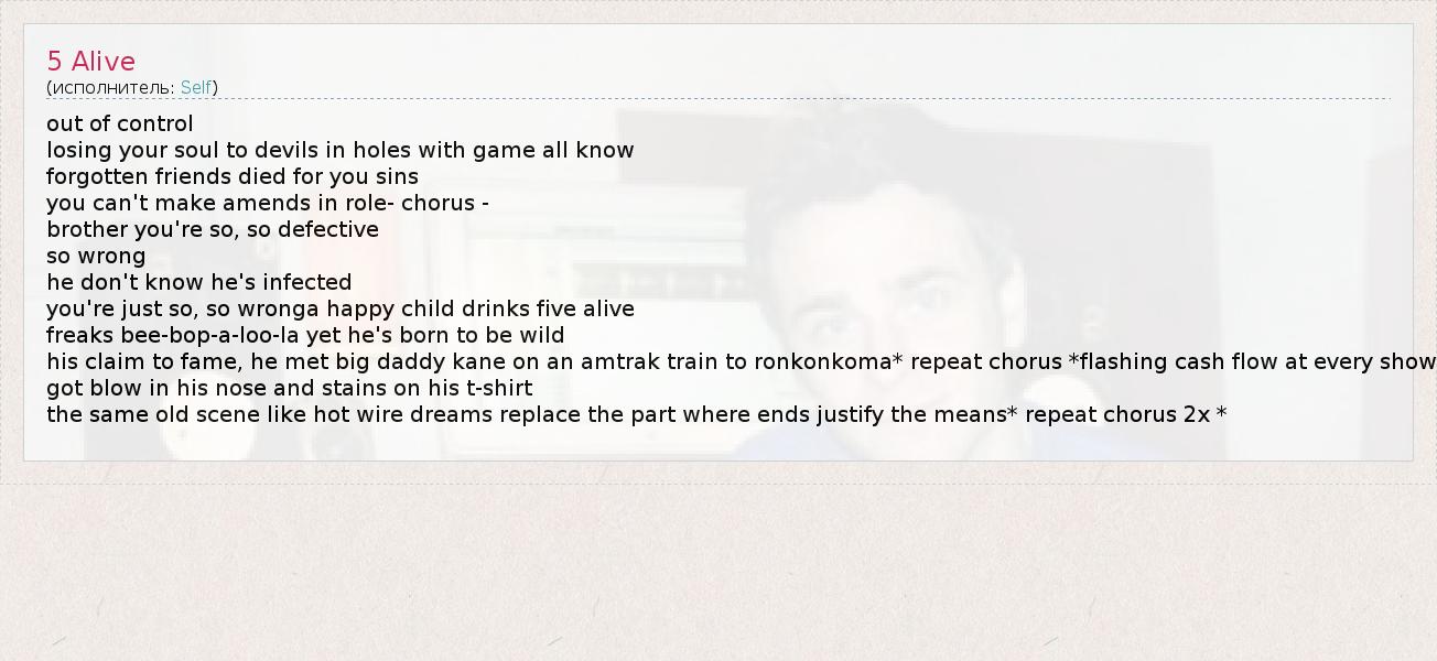 out of control losing your soul to devils in holes with game all know forgotten friends died for you sins you can't make amends in role- chorus - brother you're so, so defective so wrong he don't know he's infected you're just so, so wronga happy child drinks five alive freaks bee-bop-a-loo-la yet he's born to be wild his claim to fame, he met big daddy kane on an amtrak train to ronkonkoma* repeat chorus *flashing cash flow at every show got blow in his nose and stains on his t-shirt the same old scene like hot wire dreams replace the part where ends justify the means* repeat chorus 2x *