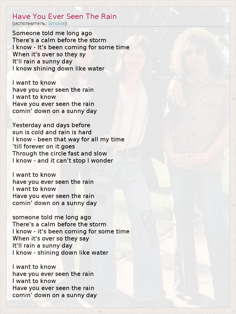 Видел ли ты когда-нибудь дождь? Кто-то говорил мне давно, что Бывает затишье перед бурей, Я знаю — она приходила на некоторое время. Когда она заканчивалась, они говорили, что Будет дождь в солнечный день. Я знаю — свет, льющийся, как вода. Я хочу знать - Видел ли ты когда-нибудь дождь... Я хочу знать - Видел ли ты когда-нибудь дождь, Падающий в солнечный день? Вчера и много дней до этого - Холодное солнце и сильный дождь. Я знаю — такое происходило всю мою жизнь. Это продолжается вечно, По кругу, быстро и медленно. Я знаю — это невозможно остановить. Я хочу знать... Я хочу знать - Видел ли ты когда-нибудь дождь... Я хочу знать - Видел ли ты когда-нибудь дождь, Падающий в солнечный день? Кто-то говорил мне давно, что Бывает затишье перед бурей, Я знаю — она приходила на некоторое время. Когда она заканчивалась, они говорили, что Будет дождь в солнечный день. Я знаю — свет, льющийся, как вода. Я хочу знать - Видел ли ты когда-нибудь дождь... Я хочу знать - Видел ли ты когда-нибудь дождь, Падающий в солнечный день?