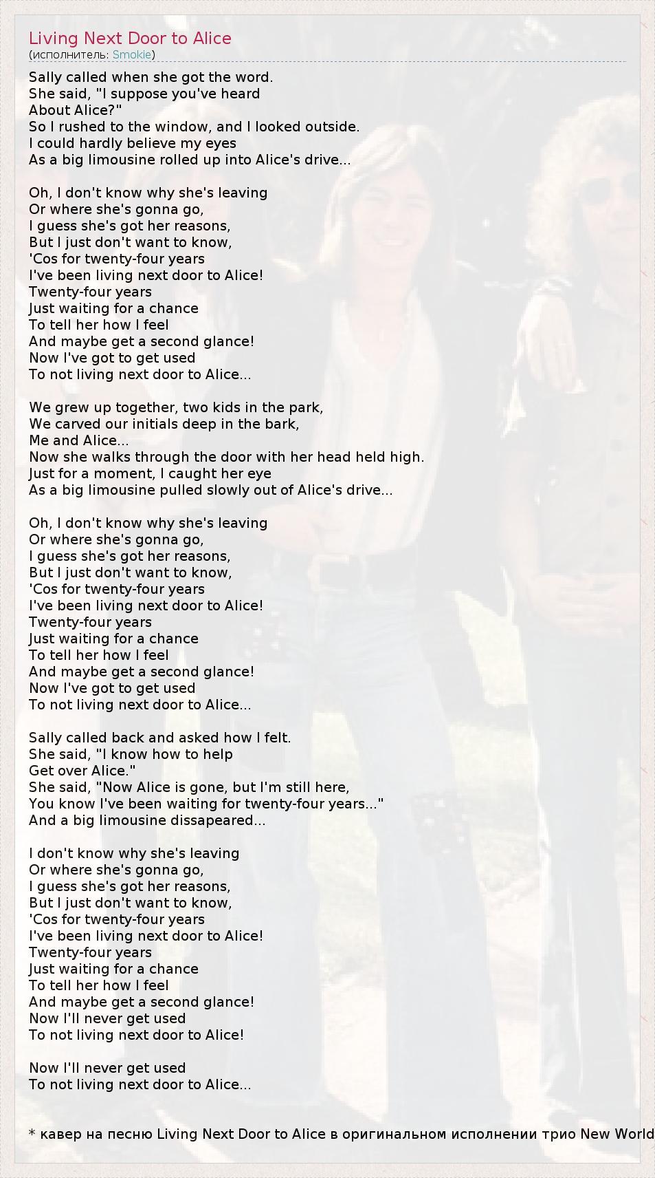 * кавер на песню Living Next Door to Alice в оригинальном исполнении трио New World