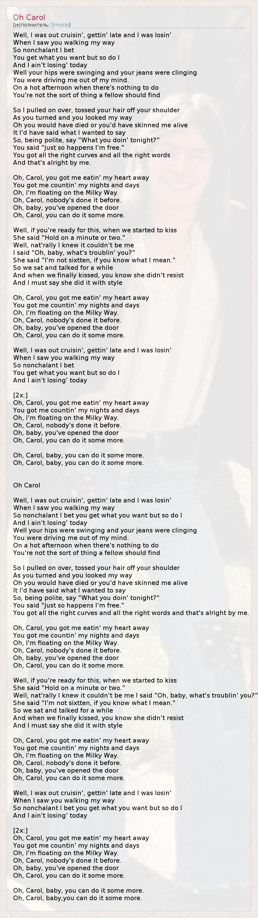 Я возвращался с прогулки, вечерело, и я растерялся, Когда я увидел тебя, идущую по моей улице. Такая беспечная, но я держу пари, Что ты получаешь то, что хочешь, как и я, И я не проиграю сегодня. Твои бедра в облегающих джинсах раскачивались, Ты сводила меня с ума. Жарким днем, когда нечего делать, Невероятно, чтобы парень наткнулся на такую, как ты. Так что, набравшись смелости, я сбросил твои волосы с твоего плеча, Ты повернулась и посмотрела в мою сторону. О, ты бы умерла или ты содрала бы с меня кожу живьем, Если бы я сказал то, что хотел сказать. Но я решил быть вежливым, и спросил: "Что вы делаете сегодня вечером?" Ты сказала: "Так случилось, что я свободна". У тебя все изгибы такие совершенные, и все слова такие красивые, И все это мне очень нравится. О, Кэрол, ты стала причиной моих сердечных терзаний, Ты заставила меня считать ночи и дни, О, я плыву по Млечному пути. О, Кэрол, никто не делал этого прежде. О, малышка, ты открыла дверь, О, Кэрол, ты можешь приоткрыть ее еще немного. Хорошо, если ты готова к этому, то начнем целоваться? Она сказала, "Потерпи минуту или две". Хорошо, естественно я знал, что дело не во мне, Я сказал: "О, малышка, что тебя беспокоит?" Она сказала, "Мне нет шестнадцати, если ты знаешь, что я подразумеваю". Так что мы сидели и разговаривали некоторое время. И когда мы наконец поцеловались, знаете, она не сопротивлялась, И должен сказать, она сделала необычно. О, Кэрол, ты стала причиной моих сердечных терзаний, Ты заставила меня считать ночи и дни, О, я плыву по Млечному пути. О, Кэрол, никто не делал этого прежде. О, малышка, ты открыла дверь, О, Кэрол, ты можешь приоткрыть ее еще немного. Я возвращался с прогулки, вечерело, и я растерялся, Когда увидел тебя идущей по моей улице, Такую беспечную, но я держу пари, Что ты получаешь то, что хочешь, как и я, И я не проиграю сегодня. [2x:] О, Кэрол, ты стала причиной моих сердечных терзаний, Ты заставила меня считать ночи и дни, О, я плыву по Млечному пути. О, Кэрол, никто не делал этого прежде. О, малышка, ты открыла дверь, О, Кэрол, ты можешь приоткрыть ее еще немного. О, Кэрол, ты можешь приоткрыть ее еще немного. О, Кэрол, ты можешь приоткрыть ее еще немного. О, Кэрол* (перевод Денисова Анна из Санкт-Петербурга) Я слонялся без дел, на девчонок глядел, И внезапно увидел тебя. Ты беспечна на вид, но я держу пари, Ты получишь, что хочешь, шутя. Моя кожа в мурашках, твои джинсы в обтяжку, Твои бедра качались слегка. Ты такая красотка, что тебе в подметки Не годится из девиц ни одна. Я решил спешить, шанс не упустить, Твоего коснулся плеча. Ты бы скальп сняла с меня, когда б сказал Я те слова, что так рвались с языка. Но решив быть галантным, я спросил, занята ль ты, Ты сказала: "Свободна пока". Все в тебе красиво: и слова и изгибы, и от этого я без ума! О, Кэрол, как сердце страдает мое: Трепещет, взмывает, поет, Ревнует, тревожится, ждет! О, Кэрол, я до тебя никогда Так не любил, не пылал, Ох, Кэрол, будь со мною всегда! Я к тебе потянулся, губ твоих коснулся, Но услышал: "Погоди-ка момент". Дело не во мне, а она в ответ: "Мне еще и шестнадцати нет". Так что мы бродили, ни о чем говорили, Я в объятья ее заключил. Ее губы сомкнулись, и в ее поцелуе Я прочел и темперамент и стиль. О, Кэрол, как сердце страдает мое: Трепещет, взмывает, поет, Ревнует, тревожится, ждет! О, Кэрол, я до тебя никогда Так не любил, не пылал, Ох, Кэрол, будь со мною всегда! Я слонялся бе