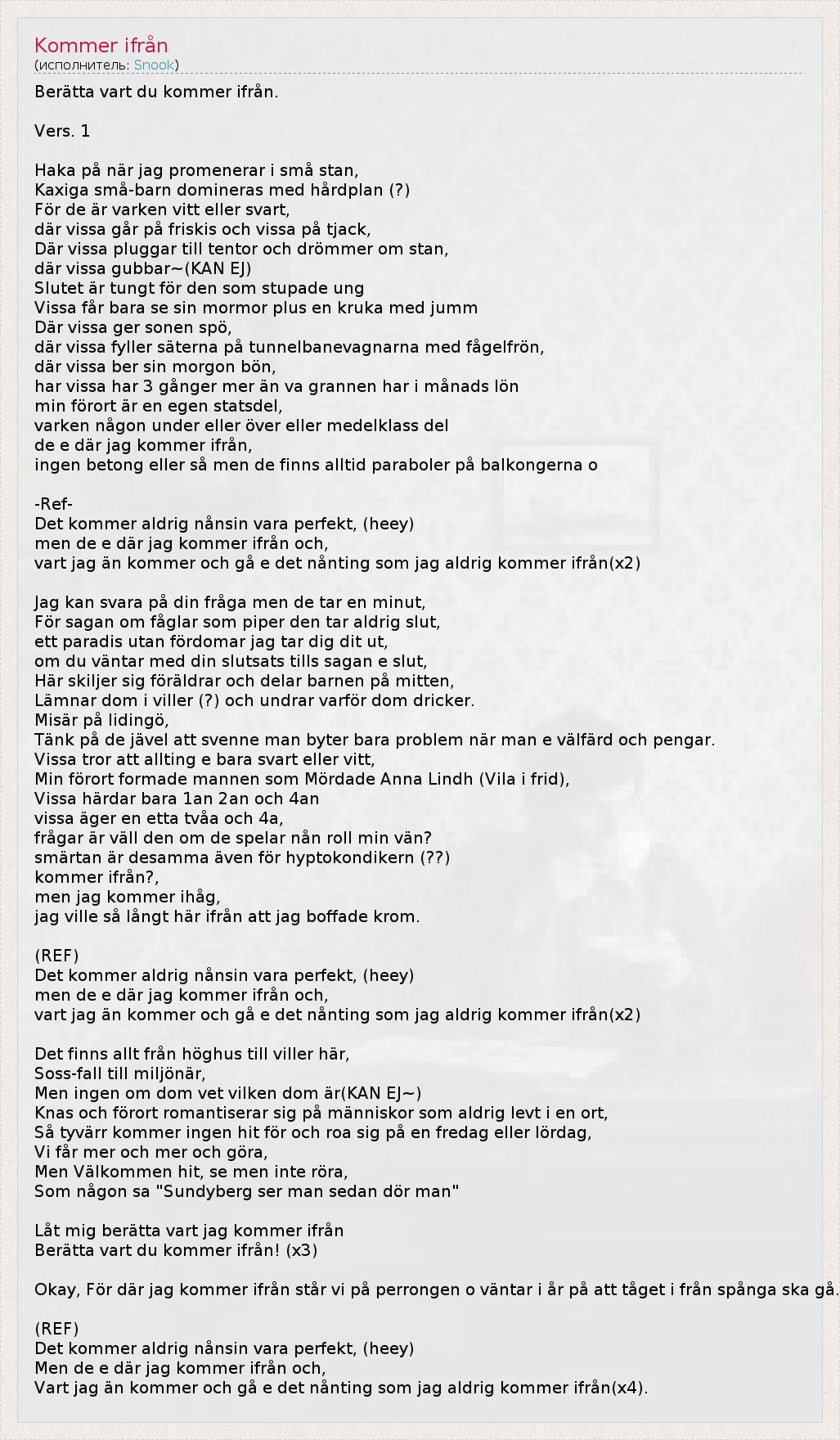 Berätta vart du kommer ifrån. Vers. 1 Haka på när jag promenerar i små stan, Kaxiga små-barn domineras med hårdplan (?) För de är varken vitt eller svart, där vissa går på friskis och vissa på tjack, Där vissa pluggar till tentor och drömmer om stan, där vissa gubbar~(KAN EJ) Slutet är tungt för den som stupade ung Vissa får bara se sin mormor plus en kruka med jumm Där vissa ger sonen spö, där vissa fyller säterna på tunnelbanevagnarna med fågelfrön, där vissa ber sin morgon bön, har vissa har 3 gånger mer än va grannen har i månads lön min förort är en egen statsdel, varken någon under eller över eller medelklass del de e där jag kommer ifrån, ingen betong eller så men de finns alltid paraboler på balkongerna o -Ref- Det kommer aldrig nånsin vara perfekt, (heey) men de e där jag kommer ifrån och, vart jag än kommer och gå e det nånting som jag aldrig kommer ifrån(x2) Jag kan svara på din fråga men de tar en minut, För sagan om fåglar som piper den tar aldrig slut, ett paradis utan fördomar jag tar dig dit ut, om du väntar med din slutsats tills sagan e slut, Här skiljer sig föräldrar och delar barnen på mitten, Lämnar dom i viller (?) och undrar varför dom dricker. Misär på lidingö, Tänk på de jävel att svenne man byter bara problem när man e välfärd och pengar. Vissa tror att allting e bara svart eller vitt, Min förort formade mannen som Mördade Anna Lindh (Vila i frid), Vissa härdar bara 1an 2an och 4an vissa äger en etta tvåa och 4a, frågar är väll den om de spelar nån roll min vän? smärtan är desamma även för hyptokondikern (??) kommer ifrån?, men jag kommer ihåg, jag ville så långt här ifrån att jag boffade krom. (REF) Det kommer aldrig nånsin vara perfekt, (heey) men de e där jag kommer ifrån och, vart jag än kommer och gå e det nånting som jag aldrig kommer ifrån(x2) Det finns allt från höghus till viller här, Soss-fall till miljönär, Men ingen om dom vet vilken dom är(KAN EJ~) Knas och förort romantiserar sig på människor som aldrig levt i en ort, Så tyvärr kommer ingen hit för och roa sig på en fredag eller lördag, Vi får mer och mer och göra, Men Välkommen hit, se men inte röra, Som någon sa "Sundyberg ser man sedan dör man" Låt mig berätta vart jag kommer ifrån Berätta vart du kommer ifrån! (x3) Okay, För där jag kommer ifrån står vi på perrongen o väntar i år på att tåget i från spånga ska gå. (REF) Det kommer aldrig nånsin vara perfekt, (heey) Men de e där jag kommer ifrån och, Vart jag än kommer och gå e det nånting som jag aldrig kommer ifrån(x4).