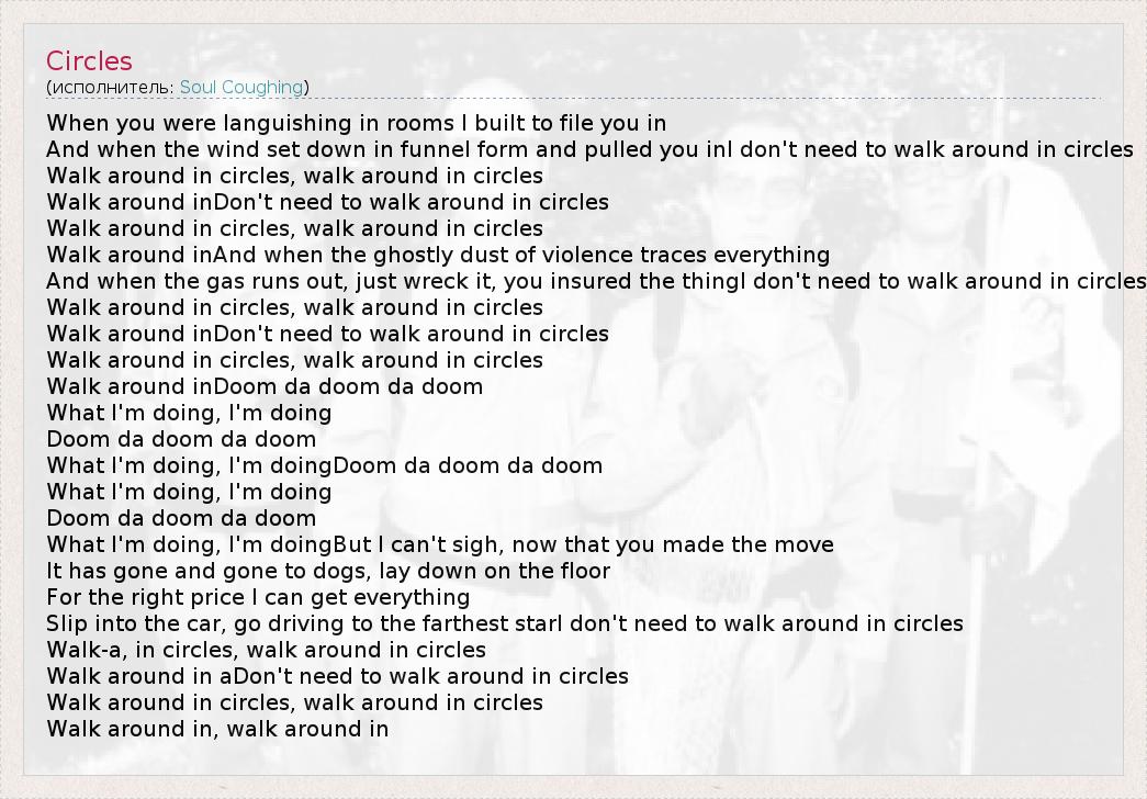 When you were languishing in rooms I built to file you in And when the wind set down in funnel form and pulled you inI don't need to walk around in circles Walk around in circles, walk around in circles Walk around inDon't need to walk around in circles Walk around in circles, walk around in circles Walk around inAnd when the ghostly dust of violence traces everything And when the gas runs out, just wreck it, you insured the thingI don't need to walk around in circles Walk around in circles, walk around in circles Walk around inDon't need to walk around in circles Walk around in circles, walk around in circles Walk around inDoom da doom da doom What I'm doing, I'm doing Doom da doom da doom What I'm doing, I'm doingDoom da doom da doom What I'm doing, I'm doing Doom da doom da doom What I'm doing, I'm doingBut I can't sigh, now that you made the move It has gone and gone to dogs, lay down on the floor For the right price I can get everything Slip into the car, go driving to the farthest starI don't need to walk around in circles Walk-a, in circles, walk around in circles Walk around in aDon't need to walk around in circles Walk around in circles, walk around in circles Walk around in, walk around in