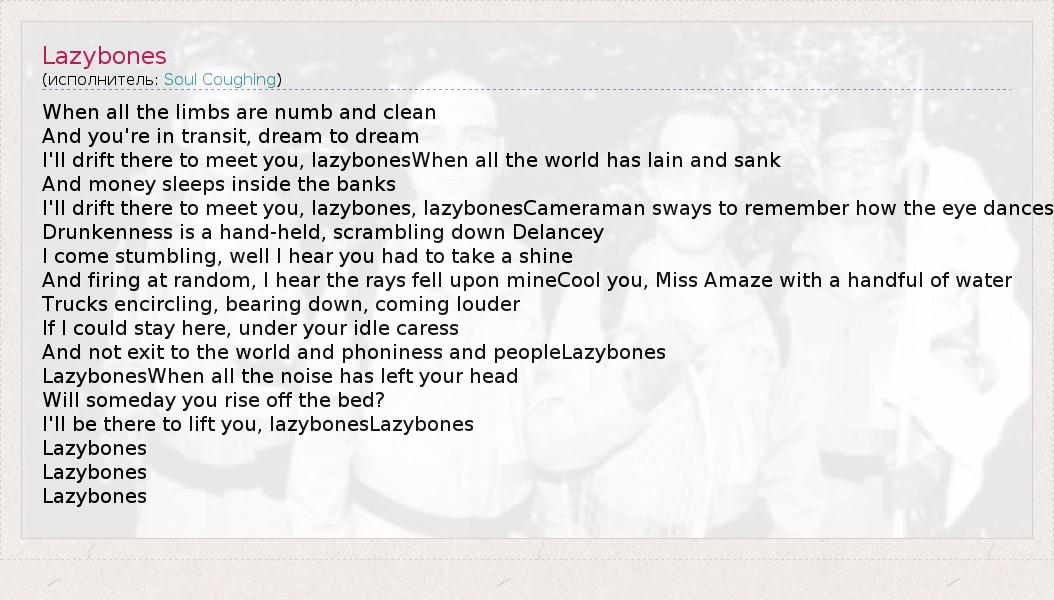 Это интересно:Soul Coughing (переводится с английского как «кашель души») - альтернативная рок-группа из Нью-Йорка. Группа имела скромный успех в течение второй половины 90-х. Soul Coughing создала преданную армию фанатов и добыла в значительной степени положительные отзывы критиков. Стив Хьюи с allmusic.com описывает Soul Coughing как одну из самых уникальных культовых групп 90-х: «Ведомое поэтическим потоком сознания лидера... продолжение
