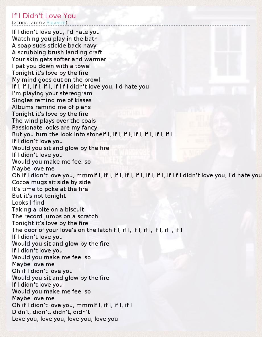 If I didn't love you, I'd hate you Watching you play in the bath A soap suds stickle back navy A scrubbing brush landing craft Your skin gets softer and warmer I pat you down with a towel Tonight it's love by the fire My mind goes out on the prowl If I, if I, if I, if I, if IIf I didn't love you, I'd hate you I'm playing your stereogram Singles remind me of kisses Albums remind me of plans Tonight it's love by the fire The wind plays over the coals Passionate looks are my fancy But you turn the look into stoneIf I, if I, if I, if I, if I, if I, if I If I didn't love you Would you sit and glow by the fire If I didn't love you Would you make me feel so Maybe love me Oh if I didn't love you, mmmIf I, if I, if I, if I, if I, if I, if I, if IIf I didn't love you, I'd hate you Cocoa mugs sit side by side It's time to poke at the fire But it's not tonight Looks I find Taking a bite on a biscuit The record jumps on a scratch Tonight it's love by the fire The door of your love's on the latchIf I, if I, if I, if I, if I, if I, if I If I didn't love you Would you sit and glow by the fire If I didn't love you Would you make me feel so Maybe love me Oh if I didn't love you Would you sit and glow by the fire If I didn't love you Would you make me feel so Maybe love me Oh if I didn't love you, mmmIf I, if I, if I, if I Didn't, didn't, didn't, didn't Love you, love you, love you, love you