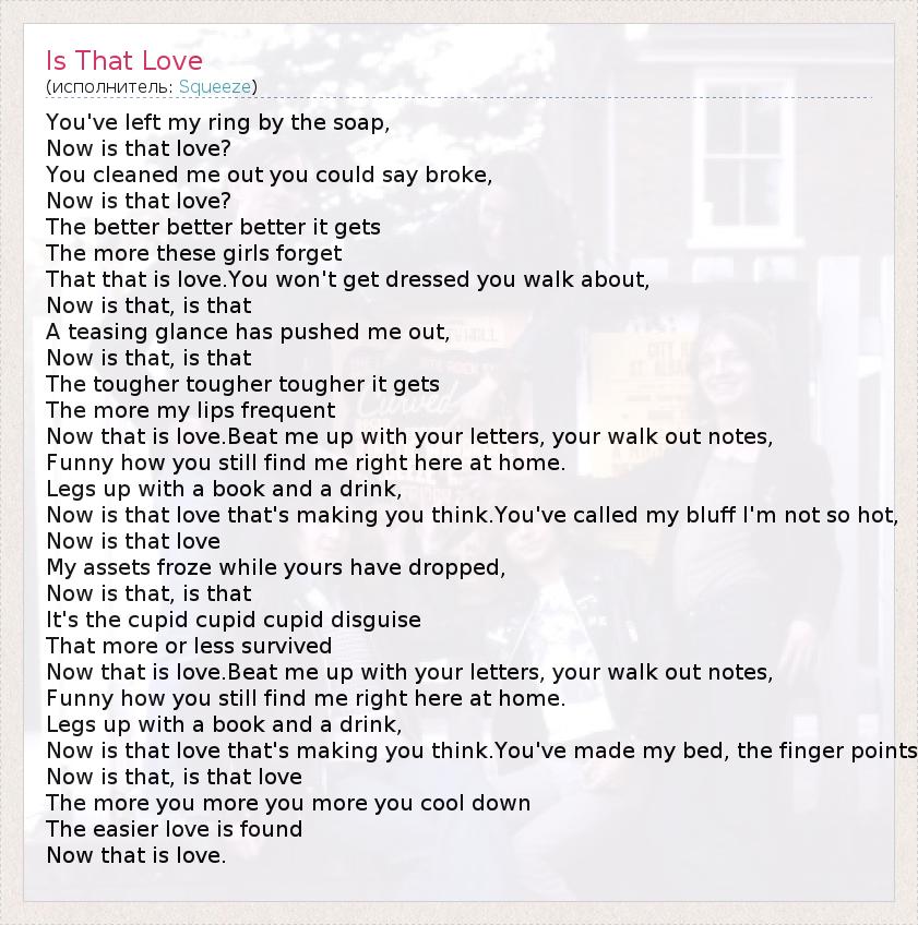 You've left my ring by the soap, Now is that love? You cleaned me out you could say broke, Now is that love? The better better better it gets The more these girls forget That that is love.You won't get dressed you walk about, Now is that, is that A teasing glance has pushed me out, Now is that, is that The tougher tougher tougher it gets The more my lips frequent Now that is love.Beat me up with your letters, your walk out notes, Funny how you still find me right here at home. Legs up with a book and a drink, Now is that love that's making you think.You've called my bluff I'm not so hot, Now is that love My assets froze while yours have dropped, Now is that, is that It's the cupid cupid cupid disguise That more or less survived Now that is love.Beat me up with your letters, your walk out notes, Funny how you still find me right here at home. Legs up with a book and a drink, Now is that love that's making you think.You've made my bed, the finger points Now is that, is that love The more you more you more you cool down The easier love is found Now that is love.
