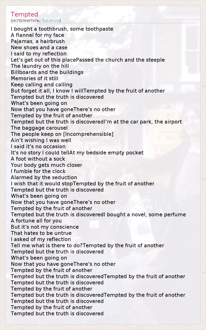 I bought a toothbrush, some toothpaste A flannel for my face Pajamas, a hairbrush New shoes and a case I said to my reflection Let's get out of this placePassed the church and the steeple The laundry on the hill Billboards and the buildings Memories of it still Keep calling and calling But forget it all, I know I willTempted by the fruit of another Tempted but the truth is discovered What's been going on Now that you have goneThere's no other Tempted by the fruit of another Tempted but the truth is discoveredI'm at the car park, the airport The baggage carousel The people keep on [Incomprehensible] Ain't wishing I was well I said it's no occasion It's no story I could tellAt my bedside empty pocket A foot without a sock Your body gets much closer I fumble for the clock Alarmed by the seduction I wish that it would stopTempted by the fruit of another Tempted but the truth is discovered What's been going on Now that you have goneThere's no other Tempted by the fruit of another Tempted but the truth is discoveredI bought a novel, some perfume A fortune all for you But it's not my conscience That hates to be untrue I asked of my reflection Tell me what is there to do?Tempted by the fruit of another Tempted but the truth is discovered What's been going on Now that you have goneThere's no other Tempted by the fruit of another Tempted but the truth is discoveredTempted by the fruit of another Tempted but the truth is discovered Tempted by the fruit of another Tempted but the truth is discoveredTempted by the fruit of another Tempted but the truth is discovered Tempted by the fruit of another Tempted but the truth is discovered