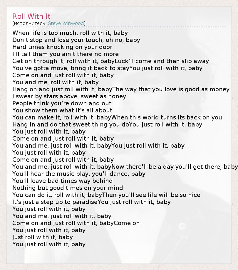 When life is too much, roll with it, baby Don't stop and lose your touch, oh no, baby Hard times knocking on your door I'll tell them you ain't there no more Get on through it, roll with it, babyLuck'll come and then slip away You've gotta move, bring it back to stayYou just roll with it, baby Come on and just roll with it, baby You and me, roll with it, baby Hang on and just roll with it, babyThe way that you love is good as money I swear by stars above, sweet as honey People think you're down and out You show them what it's all about You can make it, roll with it, babyWhen this world turns its back on you Hang in and do that sweet thing you doYou just roll with it, baby You just roll with it, baby Come on and just roll with it, baby You and me, just roll with it, babyYou just roll with it, baby You just roll with it, baby Come on and just roll with it, baby You and me, just roll with it, babyNow there'll be a day you'll get there, baby You'll hear the music play, you'll dance, baby You'll leave bad times way behind Nothing but good times on your mind You can do it, roll with it, babyThen you'll see life will be so nice It's just a step up to paradiseYou just roll with it, baby You just roll with it, baby You and me, just roll with it, baby Come on and just roll with it, babyCome on You just roll with it, baby Just roll with it, baby You just roll with it, baby ...