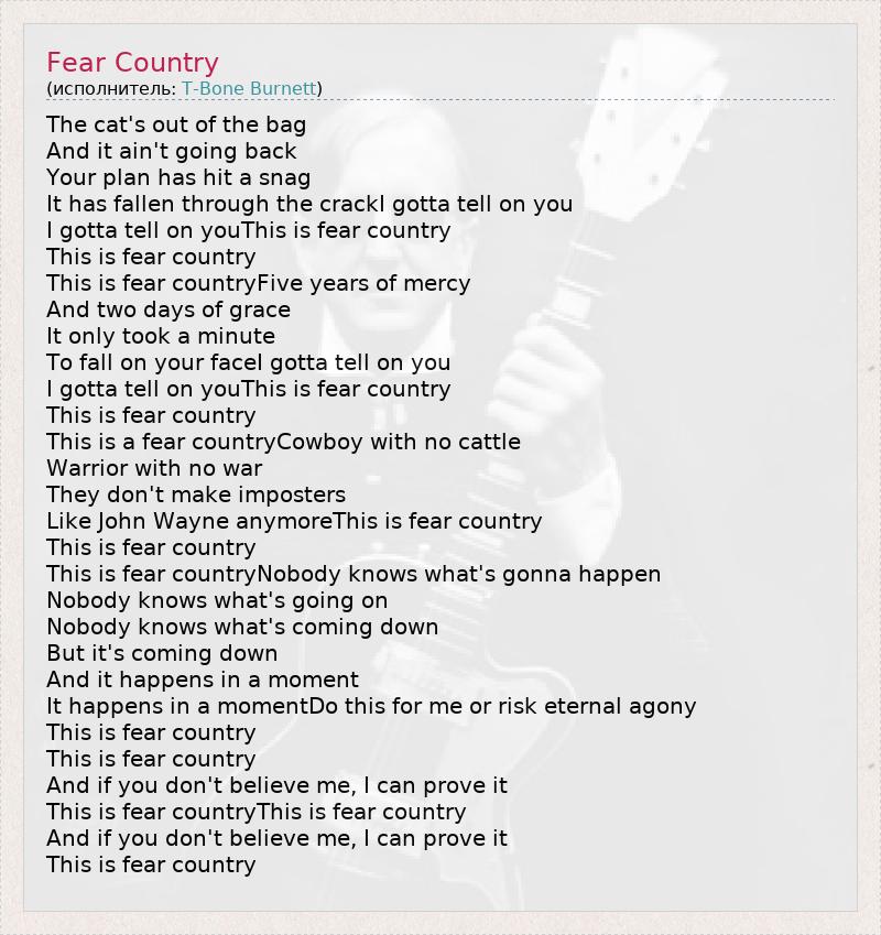 The cat's out of the bag And it ain't going back Your plan has hit a snag It has fallen through the crackI gotta tell on you I gotta tell on youThis is fear country This is fear country This is fear countryFive years of mercy And two days of grace It only took a minute To fall on your faceI gotta tell on you I gotta tell on youThis is fear country This is fear country This is a fear countryCowboy with no cattle Warrior with no war They don't make imposters Like John Wayne anymoreThis is fear country This is fear country This is fear countryNobody knows what's gonna happen Nobody knows what's going on Nobody knows what's coming down But it's coming down And it happens in a moment It happens in a momentDo this for me or risk eternal agony This is fear country This is fear country And if you don't believe me, I can prove it This is fear countryThis is fear country And if you don't believe me, I can prove it This is fear country