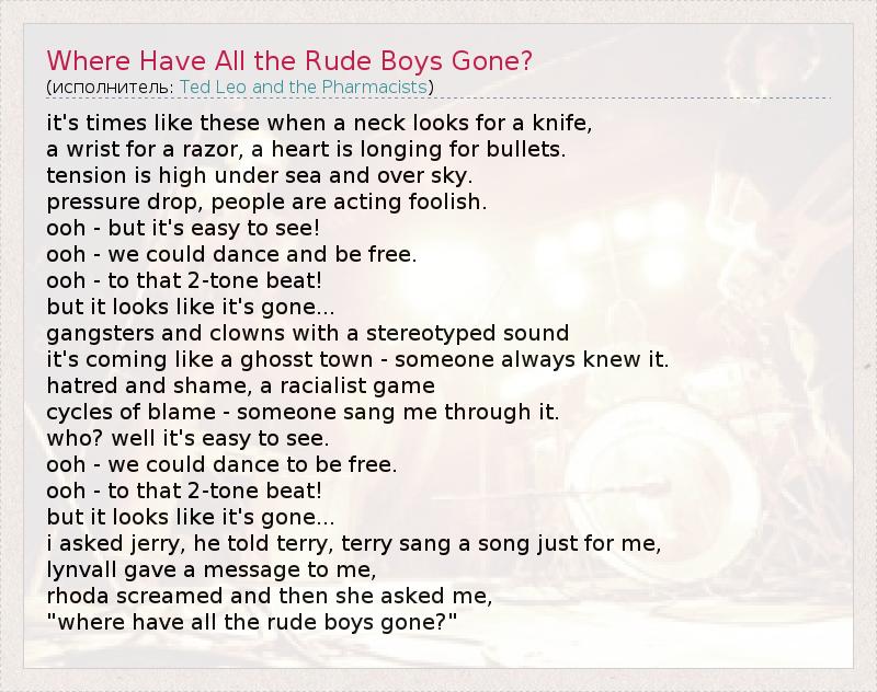 А как ты думаешь, о чем песня "Where Have All the Rude Boys Gone?" ?