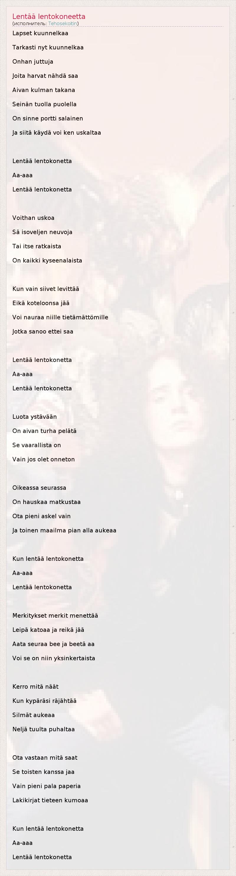 Lapset kuunnelkaa Tarkasti nyt kuunnelkaa Onhan juttuja Joita harvat nähdä saa Aivan kulman takana Seinän tuolla puolella On sinne portti salainen Ja siitä käydä voi ken uskaltaa Lentää lentokonetta Aa-aaa Lentää lentokonetta Voithan uskoa Sä isoveljen neuvoja Tai itse ratkaista On kaikki kyseenalaista Kun vain siivet levittää Eikä koteloonsa jää Voi nauraa niille tietämättömille Jotka sanoo ettei saa Lentää lentokonetta Aa-aaa Lentää lentokonetta Luota ystävään On aivan turha pelätä Se vaarallista on Vain jos olet onneton Oikeassa seurassa On hauskaa matkustaa Ota pieni askel vain Ja toinen maailma pian alla aukeaa Kun lentää lentokonetta Aa-aaa Lentää lentokonetta Merkitykset merkit menettää Leipä katoaa ja reikä jää Aata seuraa bee ja beetä aa Voi se on niin yksinkertaista Kerro mitä näät Kun kypäräsi räjähtää Silmät aukeaa Neljä tuulta puhaltaa Ota vastaan mitä saat Se toisten kanssa jaa Vain pieni pala paperia Lakikirjat tieteen kumoaa Kun lentää lentokonetta Aa-aaa Lentää lentokonetta