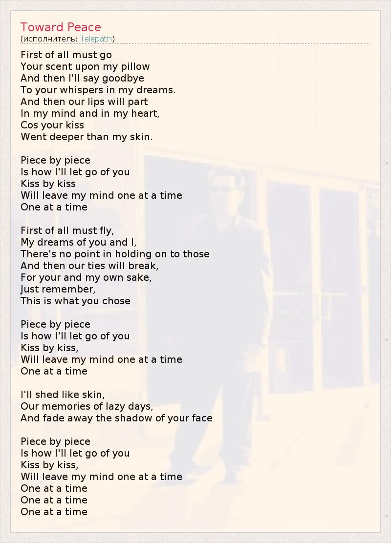 First of all must go Your scent upon my pillow And then I'll say goodbye To your whispers in my dreams. And then our lips will part In my mind and in my heart, Cos your kiss Went deeper than my skin. Piece by piece Is how I'll let go of you Kiss by kiss Will leave my mind one at a time One at a time First of all must fly, My dreams of you and I, There's no point in holding on to those And then our ties will break, For your and my own sake, Just remember, This is what you chose Piece by piece Is how I'll let go of you Kiss by kiss, Will leave my mind one at a time One at a time I'll shed like skin, Our memories of lazy days, And fade away the shadow of your face Piece by piece Is how I'll let go of you Kiss by kiss, Will leave my mind one at a time One at a time One at a time One at a time