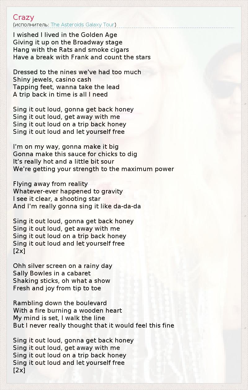 Хотела бы я жить в Золотом веке: Устраивать овации на Бродвее, Общаться со стукачами и курить сигары, Перекусывать с Фрэнком* и считать звёзды. Безупречно одетые, у нас слишком много Сверкающих драгоценностей и наличка из казино. Отбивая чечётку, хочу взять инициативу на себя, Путешествие назад в прошлое – всё, что мне нужно. Громче пой - вернёмся назад, дорогой, Громче пой - вернёмся с тобой! Громче пой на обратном пути, Громче пой – и себя освободи! Я на пути к успеху: Сделаю девчонкам соус, чтобы они обалдели. Довольно острый и чуть кислый - Мы поднимем твою силу до максимума! Отрываюсь от земли, Что бы ни случилось с силой тяжести. Ясно видно – падающая звезда, И я буду петь что-то вроде "да-да-да!" Громче пой - вернёмся назад, дорогой, Громче пой - вернёмся с тобой! Громче пой на обратном пути, Громче пой – и себя освободи! [2x] О-оу, кино в дождливый день, Салли Боулс в кабаре**. Подбрасывания трости... Ох, вот это шоу! Наслаждение до самых кончиков пальцев! Вдоль по бульвару иду я, Моё деревянное сердце полно огня. Я зациклен, переступаю черту... Но я никогда всерьёз не думал, что это будет настолько здорово. Громче пой - вернёмся назад, дорогой, Громче пой - вернёмся с тобой! Громче пой на обратном пути, Громче пой – и себя освободи! [2x] * - имеется в виду Фрэнк Синатра; ** - имеется в виду киноадаптация мюзикла "Кабаре" 1972 года. Мюзикл был поставлен по роману Кристофера Ишервуда "Прощай, Берлин!" в 1966 году. Салли Боулз – главная героиня романа, артистка кабаре.