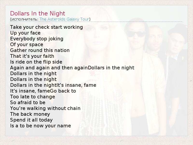 Take your check start working Up your face Everybody stop joking Of your space Gather round this nation That it's your faith Is ride on the flip side Again and again and then againDollars in the night Dollars in the night Dollars in the night Dollars in the nightIt's insane, fame It's insane, fameGo back to Too late to change So afraid to be You're walking without chain The back money Spend it all today Is a to be now your name