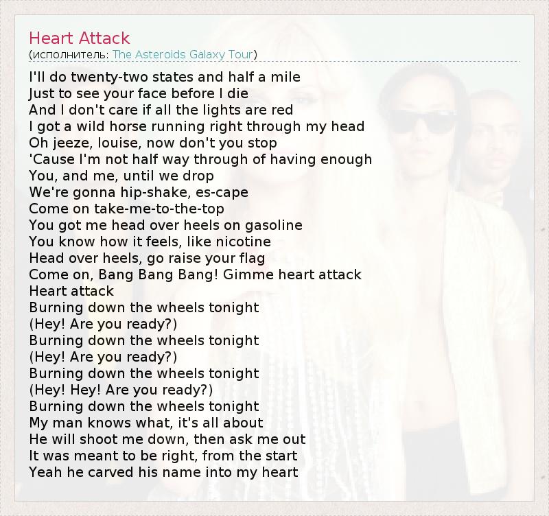 I'll do twenty-two states and half a mile Just to see your face before I die And I don't care if all the lights are red I got a wild horse running right through my head Oh jeeze, louise, now don't you stop 'Cause I'm not half way through of having enough You, and me, until we drop We're gonna hip-shake, es-cape Come on take-me-to-the-top You got me head over heels on gasoline You know how it feels, like nicotine Head over heels, go raise your flag Come on, Bang Bang Bang! Gimme heart attack Heart attack Burning down the wheels tonight (Hey! Are you ready?) Burning down the wheels tonight (Hey! Are you ready?) Burning down the wheels tonight (Hey! Hey! Are you ready?) Burning down the wheels tonight My man knows what, it's all about He will shoot me down, then ask me out It was meant to be right, from the start Yeah he carved his name into my heart