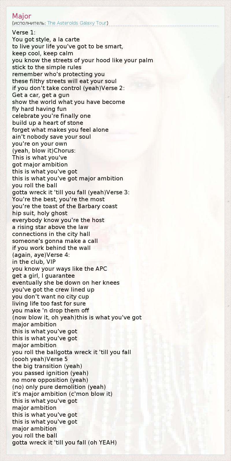 Verse 1: You got style, a la carte to live your life you've got to be smart, keep cool, keep calm you know the streets of your hood like your palm stick to the simple rules remember who's protecting you these filthy streets will eat your soul if you don't take control (yeah)Verse 2: Get a car, get a gun show the world what you have become fly hard having fun celebrate you're finally one build up a heart of stone forget what makes you feel alone ain't nobody save your soul you're on your own (yeah, blow it)Chorus: This is what you've got major ambition this is what you've got this is what you've got major ambition you roll the ball gotta wreck it 'till you fall (yeah)Verse 3: You're the best, you're the most you're the toast of the Barbary coast hip suit, holy ghost everybody know you're the host a rising star above the law connections in the city hall someone's gonna make a call if you work behind the wall (again, aye)Verse 4: in the club, VIP you know your ways like the APC get a girl, I guarantee eventually she be down on her knees you've got the crew lined up you don't want no city cup living life too fast for sure you make 'n drop them off (now blow it, oh yeah)this is what you've got major ambition this is what you've got this is what you've got major ambition you roll the ballgotta wreck it 'till you fall (oooh yeah)Verse 5 the big transition (yeah) you passed ignition (yeah) no more opposition (yeah) (no) only pure demolition (yeah) it's major ambition (c'mon blow it) this is what you've got major ambition this is what you've got this is what you've got major ambition you roll the ball gotta wreck it 'till you fall (oh YEAH)