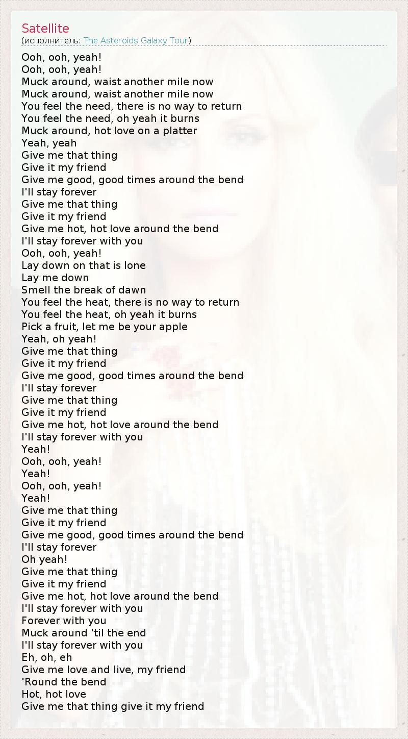 Ooh, ooh, yeah! Ooh, ooh, yeah! Muck around, waist another mile now Muck around, waist another mile now You feel the need, there is no way to return You feel the need, oh yeah it burns Muck around, hot love on a platter Yeah, yeah Give me that thing Give it my friend Give me good, good times around the bend I'll stay forever Give me that thing Give it my friend Give me hot, hot love around the bend I'll stay forever with you Ooh, ooh, yeah! Lay down on that is lone Lay me down Smell the break of dawn You feel the heat, there is no way to return You feel the heat, oh yeah it burns Pick a fruit, let me be your apple Yeah, oh yeah! Give me that thing Give it my friend Give me good, good times around the bend I'll stay forever Give me that thing Give it my friend Give me hot, hot love around the bend I'll stay forever with you Yeah! Ooh, ooh, yeah! Yeah! Ooh, ooh, yeah! Yeah! Give me that thing Give it my friend Give me good, good times around the bend I'll stay forever Oh yeah! Give me that thing Give it my friend Give me hot, hot love around the bend I'll stay forever with you Forever with you Muck around 'til the end I'll stay forever with you Eh, oh, eh Give me love and live, my friend 'Round the bend Hot, hot love Give me that thing give it my friend