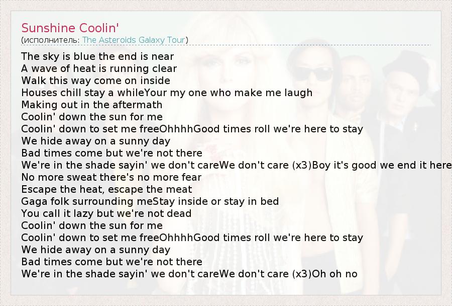 The sky is blue the end is near A wave of heat is running clear Walk this way come on inside Houses chill stay a whileYour my one who make me laugh Making out in the aftermath Coolin' down the sun for me Coolin' down to set me freeOhhhhGood times roll we're here to stay We hide away on a sunny day Bad times come but we're not there We're in the shade sayin' we don't careWe don't care (x3)Boy it's good we end it here No more sweat there's no more fear Escape the heat, escape the meat Gaga folk surrounding meStay inside or stay in bed You call it lazy but we're not dead Coolin' down the sun for me Coolin' down to set me freeOhhhhGood times roll we're here to stay We hide away on a sunny day Bad times come but we're not there We're in the shade sayin' we don't careWe don't care (x3)Oh oh no