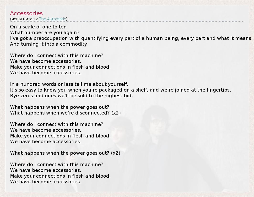On a scale of one to ten What number are you again? I've got a preoccupation with quantifying every part of a human being, every part and what it means. And turning it into a commodity Where do I connect with this machine? We have become accessories. Make your connections in flesh and blood. We have become accessories. In a hundred words or less tell me about yourself. It's so easy to know you when you're packaged on a shelf, and we're joined at the fingertips. Bye zeros and ones we'll be sold to the highest bid. What happens when the power goes out? What happens when we're disconnected? (x2) Where do I connect with this machine? We have become accessories. Make your connections in flesh and blood. We have become accessories. What happens when the power goes out? (x2) Where do I connect with this machine? We have become accessories. Make your connections in flesh and blood. We have become accessories.
