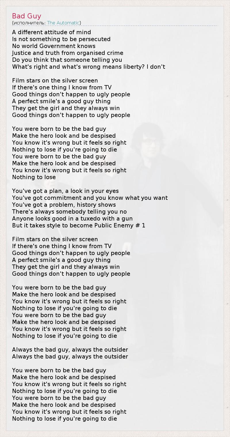 A different attitude of mind Is not something to be persecuted No world Government knows Justice and truth from organised crime Do you think that someone telling you What's right and what's wrong means liberty? I don't Film stars on the silver screen If there's one thing I know from TV Good things don't happen to ugly people A perfect smile's a good guy thing They get the girl and they always win Good things don't happen to ugly people You were born to be the bad guy Make the hero look and be despised You know it's wrong but it feels so right Nothing to lose if you're going to die You were born to be the bad guy Make the hero look and be despised You know it's wrong but it feels so right Nothing to lose You've got a plan, a look in your eyes You've got commitment and you know what you want You've got a problem, history shows There's always somebody telling you no Anyone looks good in a tuxedo with a gun But it takes style to become Public Enemy # 1 Film stars on the silver screen If there's one thing I know from TV Good things don't happen to ugly people A perfect smile's a good guy thing They get the girl and they always win Good things don't happen to ugly people You were born to be the bad guy Make the hero look and be despised You know it's wrong but it feels so right Nothing to lose if you're going to die You were born to be the bad guy Make the hero look and be despised You know it's wrong but it feels so right Nothing to lose if you're going to die Always the bad guy, always the outsider Always the bad guy, always the outsider You were born to be the bad guy Make the hero look and be despised You know it's wrong but it feels so right Nothing to lose if you're going to die You were born to be the bad guy Make the hero look and be despised You know it's wrong but it feels so right Nothing to lose if you're going to die