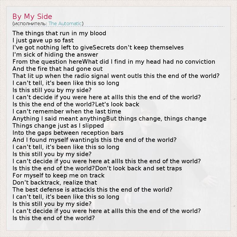 The things that run in my blood I just gave up so fast I've got nothing left to giveSecrets don't keep themselves I'm sick of hiding the answer From the question hereWhat did I find in my head had no conviction And the fire that had gone out That lit up when the radio signal went outIs this the end of the world? I can't tell, it's been like this so long Is this still you by my side? I can't decide if you were here at allIs this the end of the world? Is this the end of the world?Let's look back I can't remember when the last time Anything I said meant anythingBut things change, things change Things change just as I slipped Into the gaps between reception bars And I found myself wantingIs this the end of the world? I can't tell, it's been like this so long Is this still you by my side? I can't decide if you were here at allIs this the end of the world? Is this the end of the world?Don't look back and set traps For myself to keep me on track Don't backtrack, realize that The best defense is attackIs this the end of the world? I can't tell, it's been like this so long Is this still you by my side? I can't decide if you were here at allIs this the end of the world? Is this the end of the world?