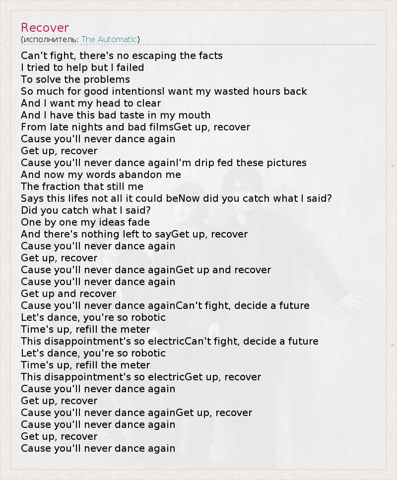 Can't fight, there's no escaping the facts I tried to help but I failed To solve the problems So much for good intentionsI want my wasted hours back And I want my head to clear And I have this bad taste in my mouth From late nights and bad filmsGet up, recover Cause you'll never dance again Get up, recover Cause you'll never dance againI'm drip fed these pictures And now my words abandon me The fraction that still me Says this lifes not all it could beNow did you catch what I said? Did you catch what I said? One by one my ideas fade And there's nothing left to sayGet up, recover Cause you'll never dance again Get up, recover Cause you'll never dance againGet up and recover Cause you'll never dance again Get up and recover Cause you'll never dance againCan't fight, decide a future Let's dance, you're so robotic Time's up, refill the meter This disappointment's so electricCan't fight, decide a future Let's dance, you're so robotic Time's up, refill the meter This disappointment's so electricGet up, recover Cause you'll never dance again Get up, recover Cause you'll never dance againGet up, recover Cause you'll never dance again Get up, recover Cause you'll never dance again