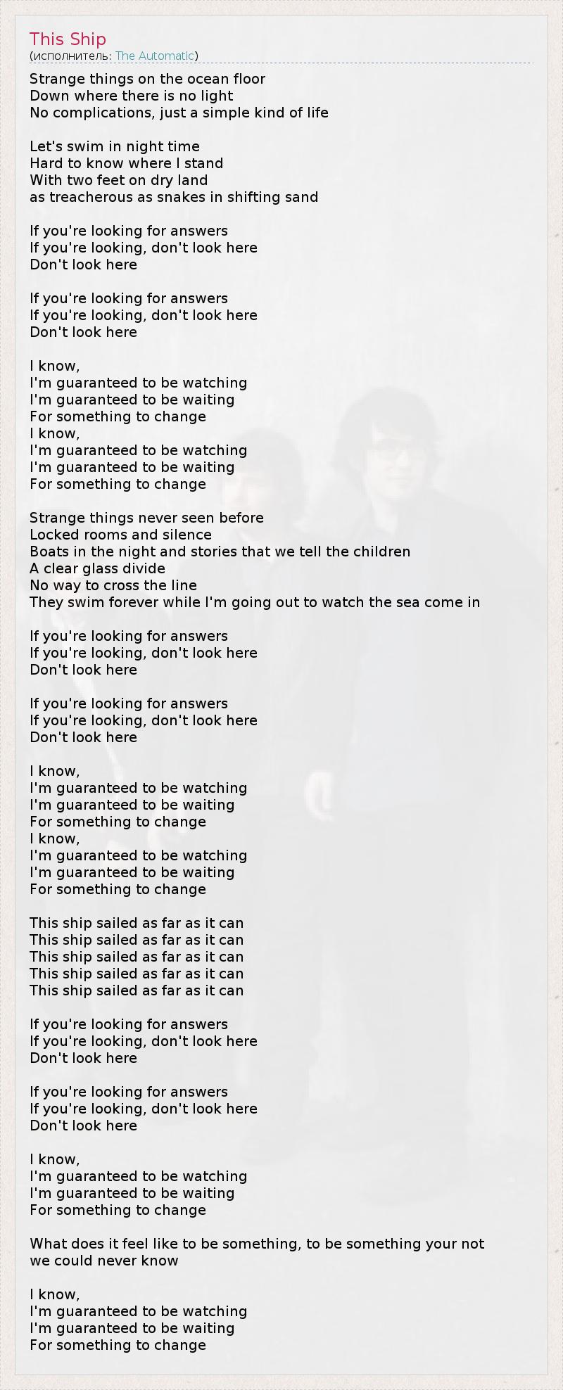 Странные вещи на дне океана Внизу, где нет света Не сложно, всего лишь простая форма жизни Давай, поплаваем ночью Трудно узнать, где я Стою на суше Такой же ненадёжной, как змеи в движущихся песках Если ты ищешь ответы Если ищешь, то не ищи их здесь Не ищи их здесь Если ты ищешь ответы Если ищешь, то не ищи их здесь Не ищи их здесь Знаю, Обещают наблюдать за мной Обещают ждать Чтобы что-то изменить Знаю, Обещают наблюдать за мной Обещают ждать Чтобы что-то изменить Странные вещи, которые никогда не видел раньше Запертые комнаты и тишина Лодки в ночи и истории, которые мы рассказываем детям Барьер из прозрачного стекла Нет способа пересечь Они плавают всегда, пока я ухожу смотреть прилив Если ты ищешь ответы Если ищешь, то не ищи их здесь Не ищи их здесь Если ты ищешь ответы Если ищешь, то не ищи их здесь Не ищи их здесь Знаю, Обещают наблюдать за мной Обещают ждать Чтобы что-то изменить Знаю, Обещают наблюдать за мной Обещают ждать Чтобы что-то изменить Этот корабль уплыл так далеко, насколько мог Этот корабль уплыл так далеко, насколько мог Этот корабль уплыл так далеко, насколько мог Этот корабль уплыл так далеко, насколько мог Этот корабль уплыл так далеко, насколько мог Если ты ищешь ответы Если ищешь, то не ищи их здесь Не ищи их здесь Если ты ищешь ответы Если ищешь, то не ищи их здесь Не ищи их здесь Знаю, Обещают наблюдать за мной Обещают ждать Чтобы что-то изменить Как это быть кем-то, кем-то, не собой Мы никогда не узнаем Знаю, Обещают наблюдать за мной Обещают ждать Чтобы что-то изменить