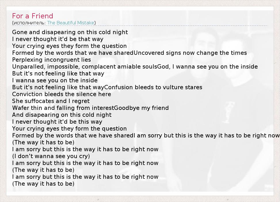 Gone and disapearing on this cold night I never thought it'd be that way Your crying eyes they form the question Formed by the words that we have sharedUncovered signs now change the times Perplexing incongruent lies Unparalled, impossible, complacent amiable soulsGod, I wanna see you on the inside But it's not feeling like that way I wanna see you on the inside But it's not feeling like that wayConfusion bleeds to vulture stares Conviction bleeds the silence here She suffocates and I regret Wafer thin and falling from interestGoodbye my friend And disapearing on this cold night I never thought it'd be this way Your crying eyes they form the question Formed by the words that we have sharedI am sorry but this is the way it has to be right now (The way it has to be) I am sorry but this is the way it has to be right now (I don't wanna see you cry) I am sorry but this is the way it has to be right now (The way it has to be) I am sorry but this is the way it has to be right now (The way it has to be)