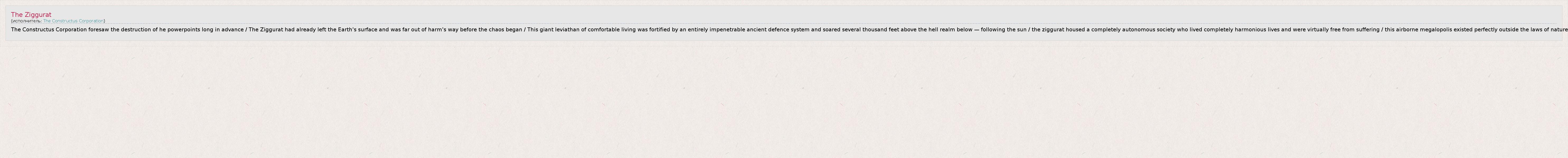 The Constructus Corporation foresaw the destruction of he powerpoints long in advance / The Ziggurat had already left the Earth's surface and was far out of harm's way before the chaos began / This giant leviathan of comfortable living was fortified by an entirely impenetrable ancient defence system and soared several thousand feet above the hell realm below — following the sun / the ziggurat housed a completely autonomous society who lived completely harmonious lives and were virtually free from suffering / this airborne megalopolis existed perfectly outside the laws of nature