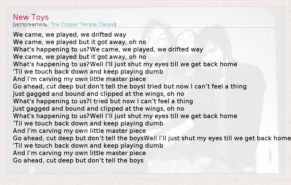 Это интересно:Биография: Крутая прическа еще не делает из музыканта звезду мирового масштаба. Но может существенно способствовать привлечению внимания к начинающей группе. Шестерка из английского Рединга The Cooper Temple Clause славна не только и не столько бардаком НА головах, сколько беспорядком В головах ее участников. «Мы играем музыку, которую хотели слышать от других, но - не услышали», - говорит вокалист... продолжение