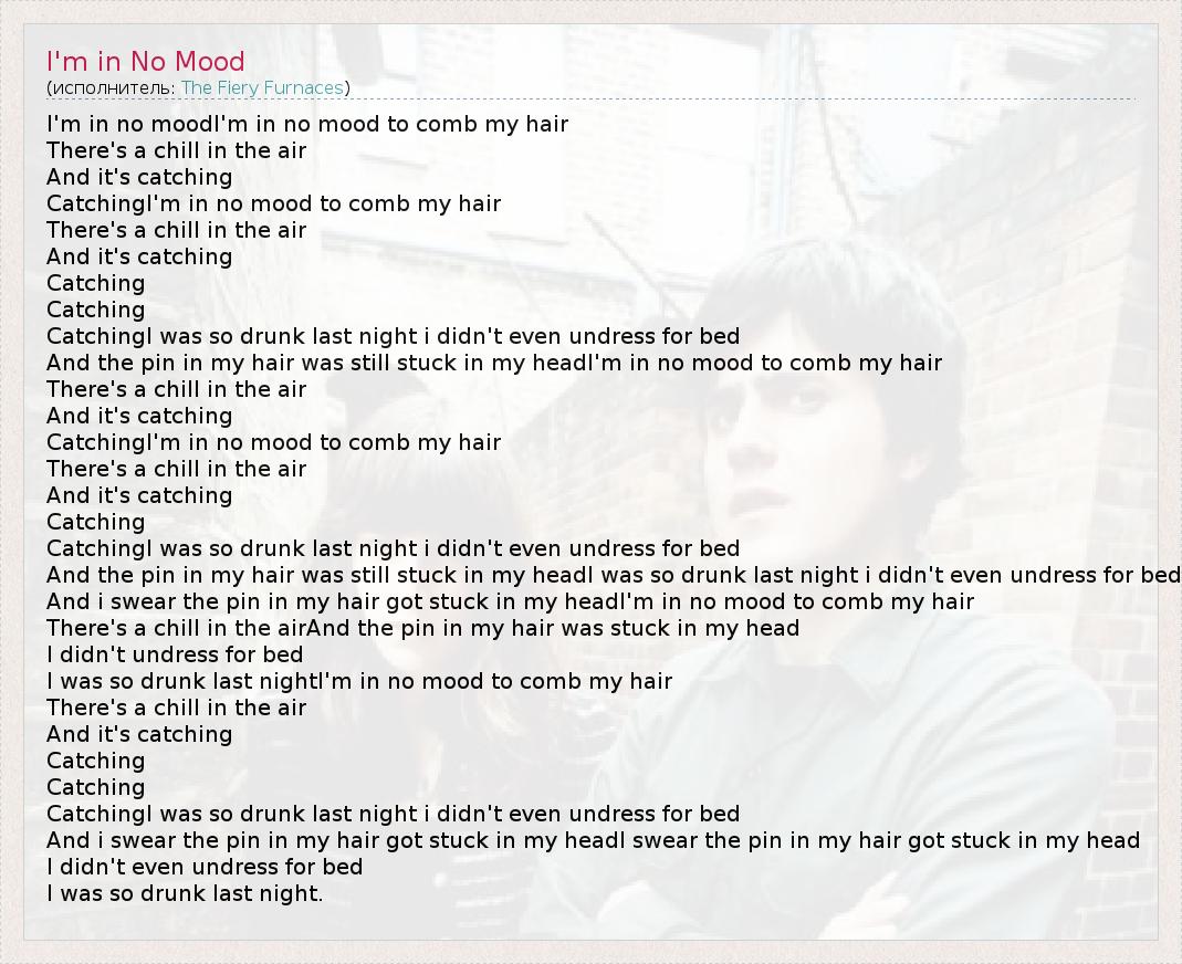 I'm in no moodI'm in no mood to comb my hair There's a chill in the air And it's catching CatchingI'm in no mood to comb my hair There's a chill in the air And it's catching Catching Catching CatchingI was so drunk last night i didn't even undress for bed And the pin in my hair was still stuck in my headI'm in no mood to comb my hair There's a chill in the air And it's catching CatchingI'm in no mood to comb my hair There's a chill in the air And it's catching Catching CatchingI was so drunk last night i didn't even undress for bed And the pin in my hair was still stuck in my headI was so drunk last night i didn't even undress for bed And i swear the pin in my hair got stuck in my headI'm in no mood to comb my hair There's a chill in the airAnd the pin in my hair was stuck in my head I didn't undress for bed I was so drunk last nightI'm in no mood to comb my hair There's a chill in the air And it's catching Catching Catching CatchingI was so drunk last night i didn't even undress for bed And i swear the pin in my hair got stuck in my headI swear the pin in my hair got stuck in my head I didn't even undress for bed I was so drunk last night.