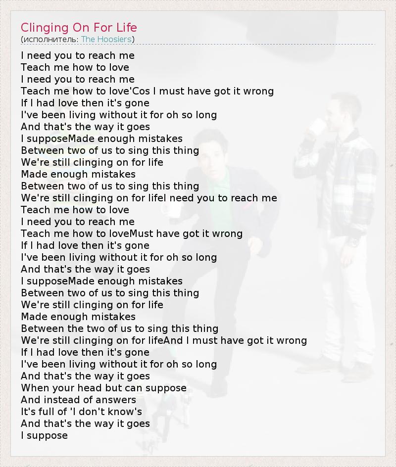 I need you to reach me Teach me how to love I need you to reach me Teach me how to love'Cos I must have got it wrong If I had love then it's gone I've been living without it for oh so long And that's the way it goes I supposeMade enough mistakes Between two of us to sing this thing We're still clinging on for life Made enough mistakes Between two of us to sing this thing We're still clinging on for lifeI need you to reach me Teach me how to love I need you to reach me Teach me how to loveMust have got it wrong If I had love then it's gone I've been living without it for oh so long And that's the way it goes I supposeMade enough mistakes Between two of us to sing this thing We're still clinging on for life Made enough mistakes Between the two of us to sing this thing We're still clinging on for lifeAnd I must have got it wrong If I had love then it's gone I've been living without it for oh so long And that's the way it goes When your head but can suppose And instead of answers It's full of 'I don't know's And that's the way it goes I suppose