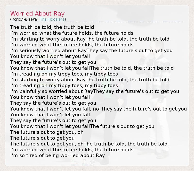 The truth be told, the truth be told I'm worried what the future holds, the future holds I'm starting to worry about RayThe truth be told, the truth be told I'm worried what the future holds, the future holds I'm seriously worried about RayThey say the future's out to get you You know that I won't let you fall They say the future's out to get you You know that I won't let you fallThe truth be told, the truth be told I'm treading on my tippy toes, my tippy toes I'm starting to worry about RayThe truth be told, the truth be told I'm treading on my tippy toes, my tippy toes I'm painfully so worried about RayThey say the future's out to get you You know that I won't let you fall They say the future's out to get you You know that I won't let you fall, no!They say the future's out to get you You know that I won't let you fall They say the future's out to get you You know that I won't let you fallThe future's out to get you The future's out to get you, oh The future's out to get you The future's out to get you, ohThe truth be told, the truth be told I'm worried what the future holds, the future holds I'm so tired of being worried about Ray