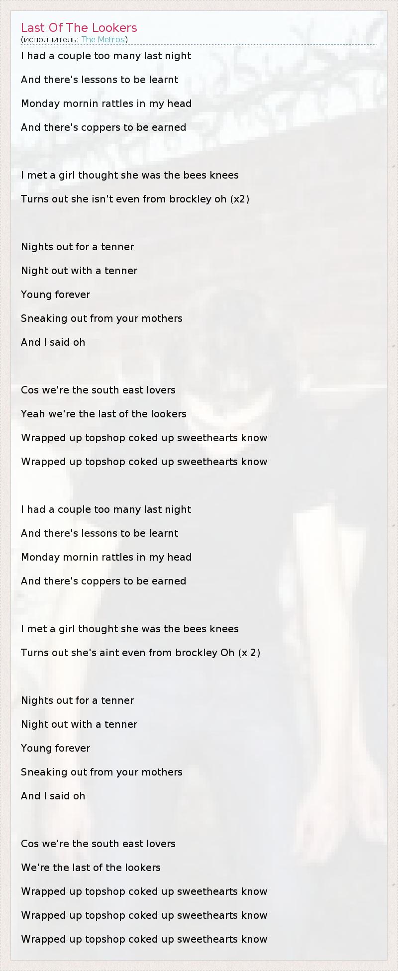 I had a couple too many last night And there's lessons to be learnt Monday mornin rattles in my head And there's coppers to be earned I met a girl thought she was the bees knees Turns out she isn't even from brockley oh (x2) Nights out for a tenner Night out with a tenner Young forever Sneaking out from your mothers And I said oh Cos we're the south east lovers Yeah we're the last of the lookers Wrapped up topshop coked up sweethearts know Wrapped up topshop coked up sweethearts know I had a couple too many last night And there's lessons to be learnt Monday mornin rattles in my head And there's coppers to be earned I met a girl thought she was the bees knees Turns out she's aint even from brockley Oh (x 2) Nights out for a tenner Night out with a tenner Young forever Sneaking out from your mothers And I said oh Cos we're the south east lovers We're the last of the lookers Wrapped up topshop coked up sweethearts know Wrapped up topshop coked up sweethearts know Wrapped up topshop coked up sweethearts know