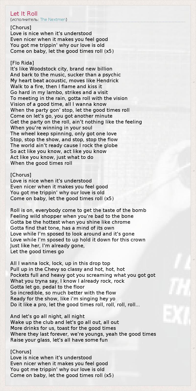 [Chorus] Love is nice when it's understood Even nicer when it makes you feel good You got me trippin' why our love is old Come on baby, let the good times roll (x5) [Flo Rida] It's like Woodstock city, brand new billion And bark to the music, sucker than a psychic My heart beat acoustic, moves like Hendrick Walk to a fire, then I flame and kiss it Go hard in my lambo, strikes and a visit To meeting in the rain, gotta roll with the vision Vision of a good time, all I wanna know When the party gon' stop, let the good times roll Come on let's go, you got another minute Get the party on the roll, ain't nothing like the feeling When you're winning in your soul The wheel keep spinning, only got one love Stop, stop the show, and stop, stop the flow The world ain't ready cause I rock the globe So act like you know, act like you know Act like you know, just what to do When the good times roll [Chorus] Love is nice when it's understood Even nicer when it makes you feel good You got me trippin' why our love is old Come on baby, let the good times roll (x5) Roll is on, everybody come to get the taste of the bomb Feeling wild shopper when you're bad to the bone Gotta be the hottest when you shine like chrome Gotta find that tone, has a mind of its own Love while I'm sposed to look around and it's gone Love while I'm sposed to up hold it down for this crown Just like her, I'm already gone, Let the good times go All I wanna lock, lock, up in this drop top Pull up in the Chevy so classy and hot, hot, hot Pockets full and heavy got you screaming what you got got What you tryna say, I know I already rock, rock Gotta let go, pedal to the floor So incredible, so much better with the flow Ready for the show, like i'm singing hey yo Do it like a pro, let the good times roll, roll, roll, roll... And let's go all night, all night Wake up the club and let's go all out, all out More drinks for us, toast for the good times Where they last forever, we're youngs, yeah the good times Raise your glass, let's all have some fun [Chorus] Love is nice when it's understood Even nicer when it makes you feel good You got me trippin' why our love is old Come on baby, let the good times roll (x5)