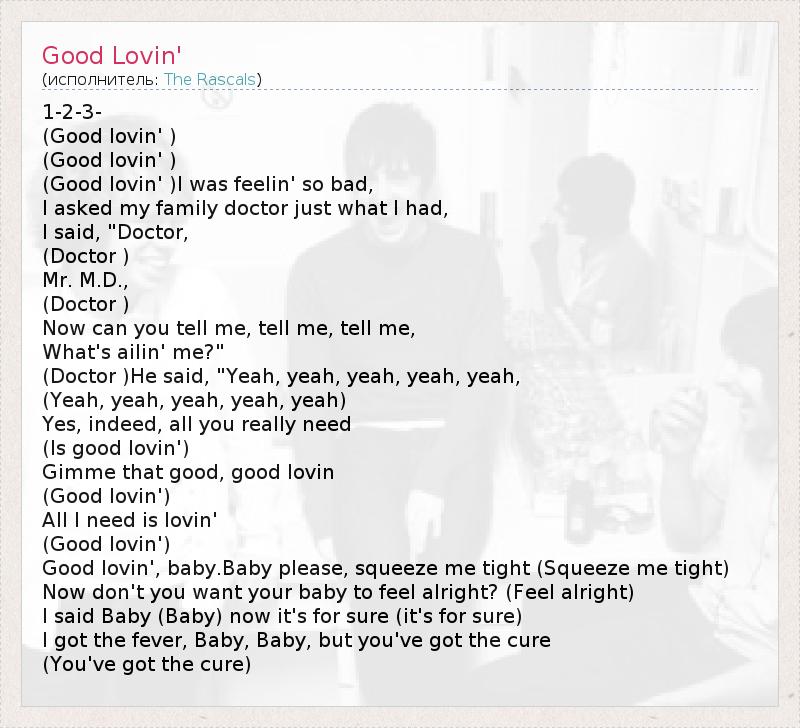 1-2-3- (Good lovin' ) (Good lovin' ) (Good lovin' )I was feelin' so bad, I asked my family doctor just what I had, I said, "Doctor, (Doctor ) Mr. M.D., (Doctor ) Now can you tell me, tell me, tell me, What's ailin' me?" (Doctor )He said, "Yeah, yeah, yeah, yeah, yeah, (Yeah, yeah, yeah, yeah, yeah) Yes, indeed, all you really need (Is good lovin') Gimme that good, good lovin (Good lovin') All I need is lovin' (Good lovin') Good lovin', baby.Baby please, squeeze me tight (Squeeze me tight) Now don't you want your baby to feel alright? (Feel alright) I said Baby (Baby) now it's for sure (it's for sure) I got the fever, Baby, Baby, but you've got the cure (You've got the cure)