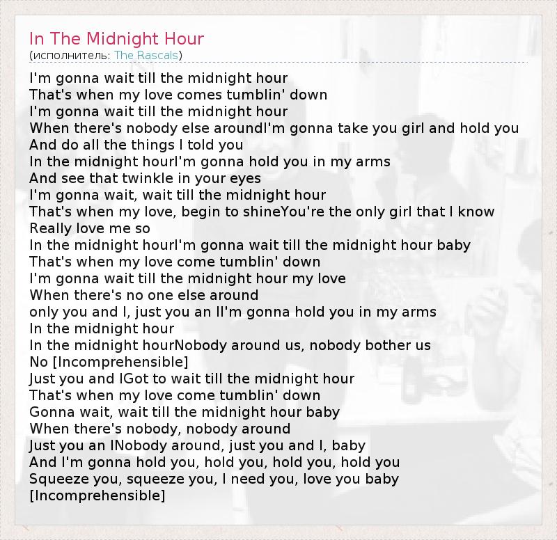 In the midnight hourI'm gonna wait till the midnight hour baby