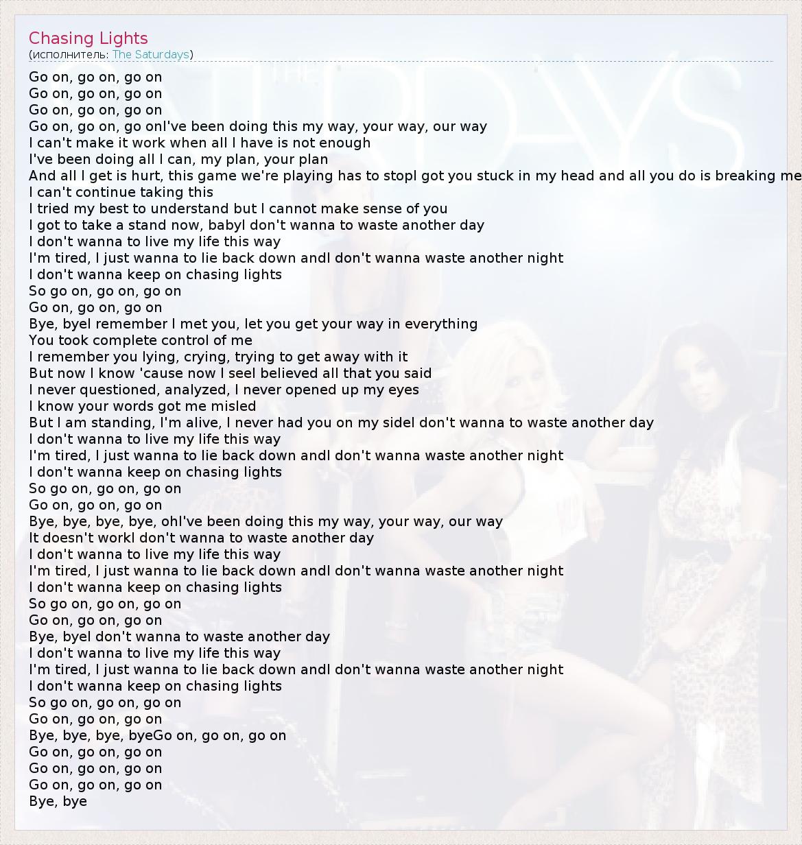 А как ты думаешь, о чем песня "Chasing Lights" ?