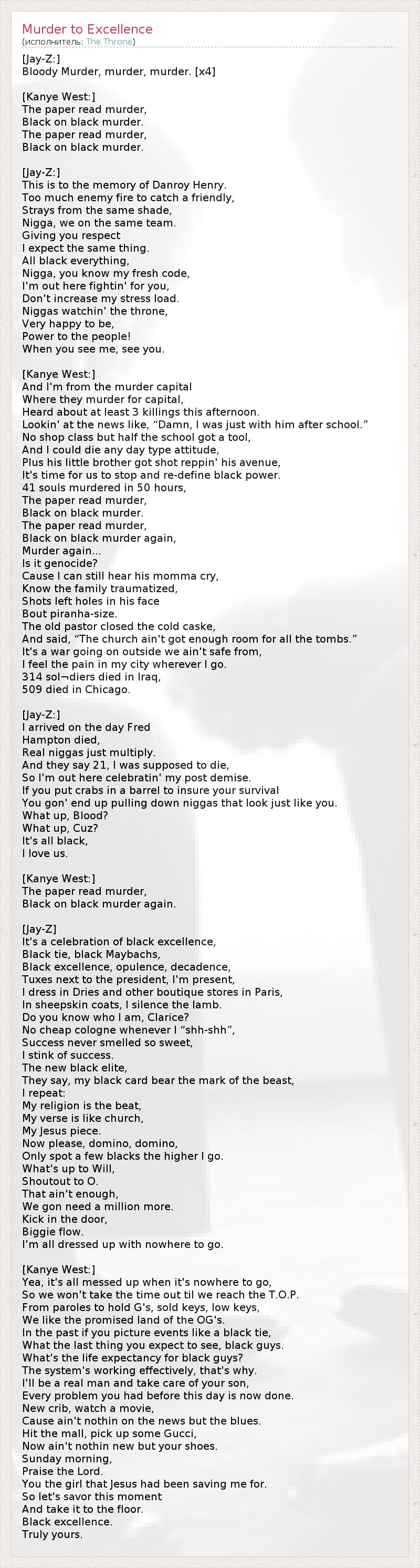 А как ты думаешь, о чем песня "Murder to Excellence" ?