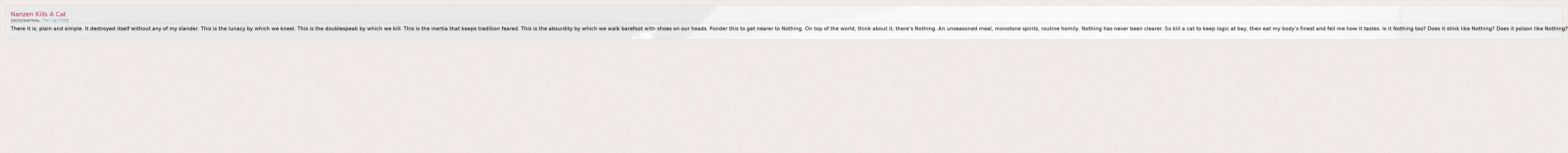 There it is, plain and simple. It destroyed itself without any of my slander. This is the lunacy by which we kneel. This is the doublespeak by which we kill. This is the inertia that keeps tradition feared. This is the absurdity by which we walk barefoot with shoes on our heads. Ponder this to get nearer to Nothing. On top of the world, think about it, there's Nothing. An unseasoned meal, monotone spirits, routine homily. Nothing has never been clearer. So kill a cat to keep logic at bay, then eat my body's finest and fell me how it tastes. Is it Nothing too? Does it stink like Nothing? Does it poison like Nothing?