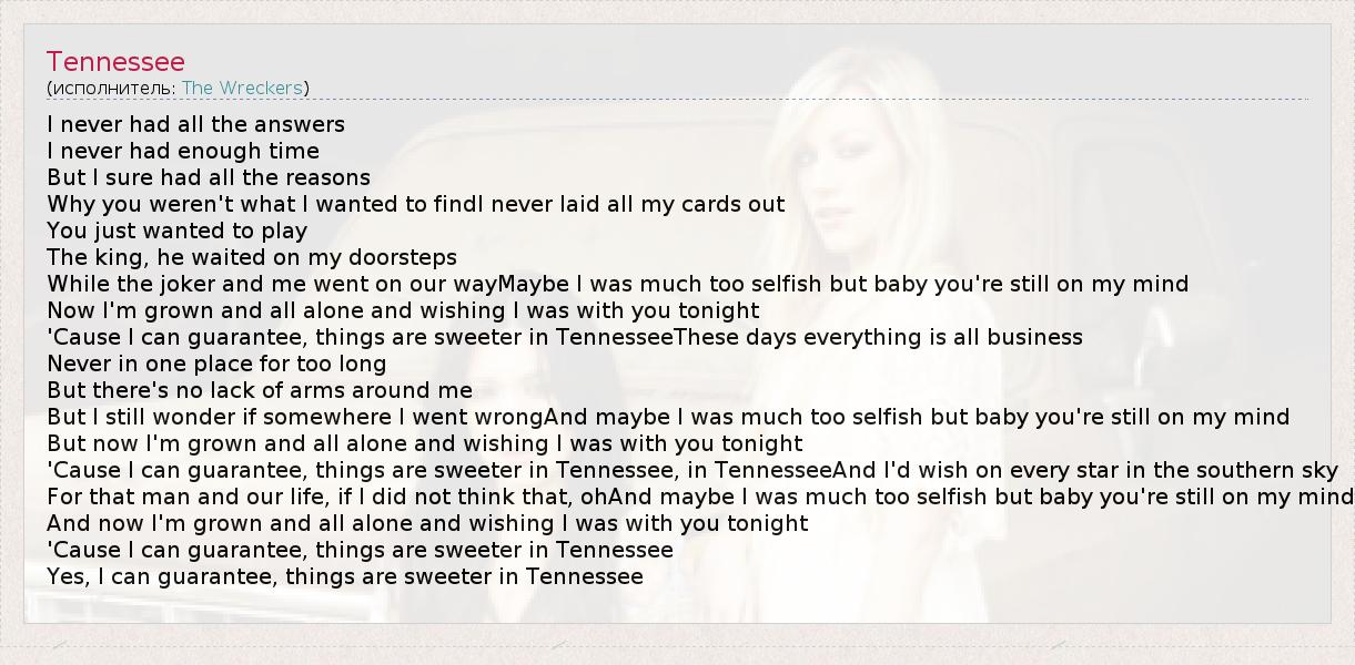 'Cause I can guarantee, things are sweeter in Tennessee, in TennesseeAnd I'd wish on every star in the southern sky