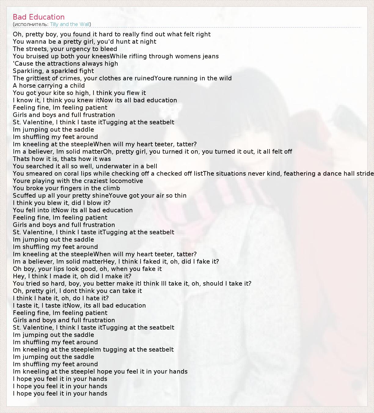 Oh, pretty boy, you found it hard to really find out what felt right You wanna be a pretty girl, you'd hunt at night The streets, your urgency to bleed You bruised up both your kneesWhile rifling through womens jeans 'Cause the attractions always high Sparkling, a sparkled fight The grittiest of crimes, your clothes are ruinedYoure running in the wild A horse carrying a child You got your kite so high, I think you flew it I know it, I think you knew itNow its all bad education Feeling fine, Im feeling patient Girls and boys and full frustration St. Valentine, I think I taste itTugging at the seatbelt Im jumping out the saddle Im shuffling my feet around Im kneeling at the steepleWhen will my heart teeter, tatter? Im a believer, Im solid matterOh, pretty girl, you turned it on, you turned it out, it all felt off Thats how it is, thats how it was You searched it all so well, underwater in a bell You smeared on coral lips while checking off a checked off listThe situations never kind, feathering a dance hall stride Youre playing with the craziest locomotive You broke your fingers in the climb Scuffed up all your pretty shineYouve got your air so thin I think you blew it, did I blow it? You fell into itNow its all bad education Feeling fine, Im feeling patient Girls and boys and full frustration St. Valentine, I think I taste itTugging at the seatbelt Im jumping out the saddle Im shuffling my feet around Im kneeling at the steepleWhen will my heart teeter, tatter? Im a believer, Im solid matterHey, I think I faked it, oh, did I fake it? Oh boy, your lips look good, oh, when you fake it Hey, I think I made it, oh did I make it? You tried so hard, boy, you better make itI think Ill take it, oh, should I take it? Oh, pretty girl, I dont think you can take it I think I hate it, oh, do I hate it? I taste it, I taste itNow, its all bad education Feeling fine, Im feeling patient Girls and boys and full frustration St. Valentine, I think I taste itTugging at the seatbelt Im jumping out the saddle Im shuffling my feet around Im kneeling at the steepleIm tugging at the seatbelt Im jumping out the saddle Im shuffling my feet around Im kneeling at the steepleI hope you feel it in your hands I hope you feel it in your hands I hope you feel it in your hands I hope you feel it in your hands