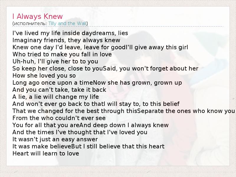 А как ты думаешь, о чем песня "I Always Knew" ?