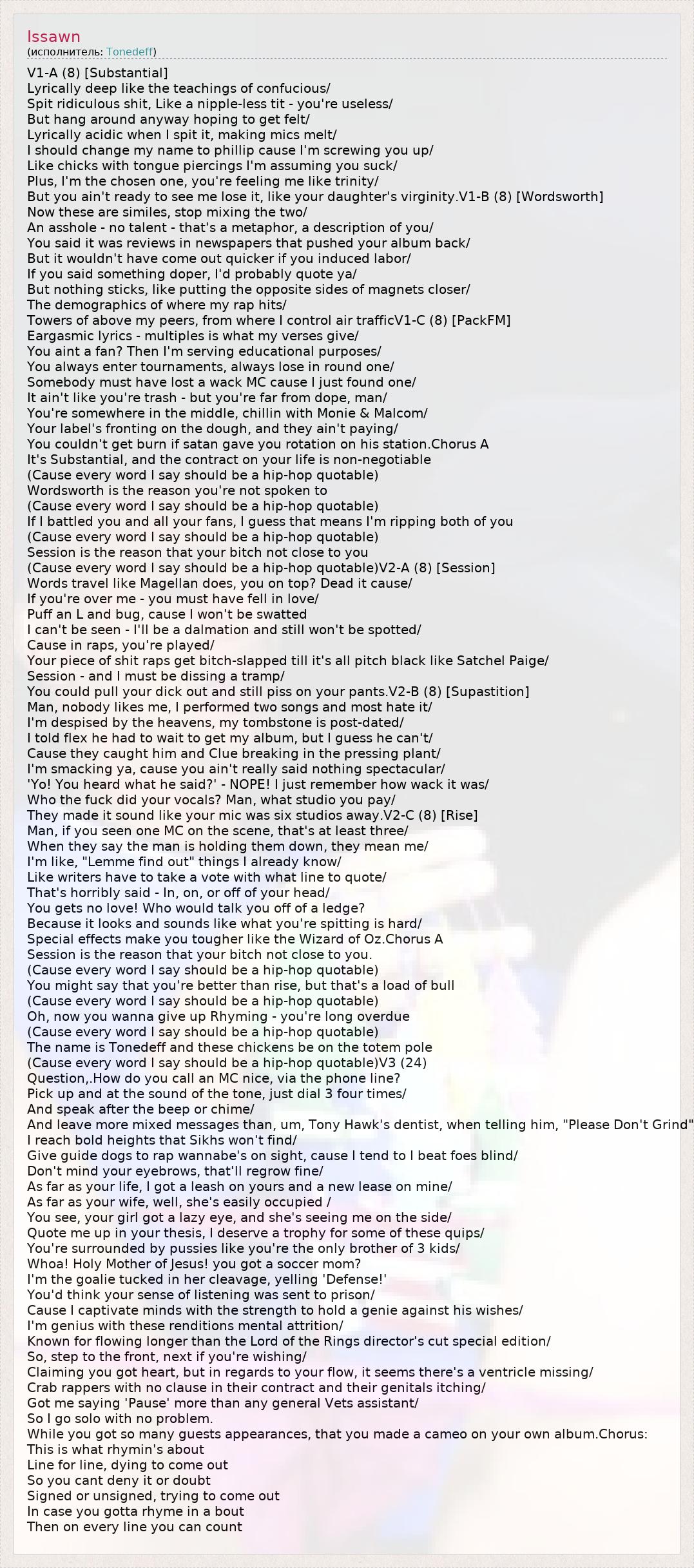 Это интересно:Tonedeff (born Anthony Rojas on December 14, 1978) is an American rapper, producer, and singer-songwriter from Queens, New York City.Known for his breathless vocal performances, rapid-fire delivery, which is alleged to be among the fastest in hip hop history at 13.5 syllables per second, he is said by critics as having "the best flows" of the current generation of emcees. Having developed a reputation as a self-sufficient artist who has been known to design his own album covers and edit his own videos, he is also known to sing and play piano on his tracks, as well as self-produce them.Tonedeff first gained national recognition on the underground hip hop scene after winning... продолжение