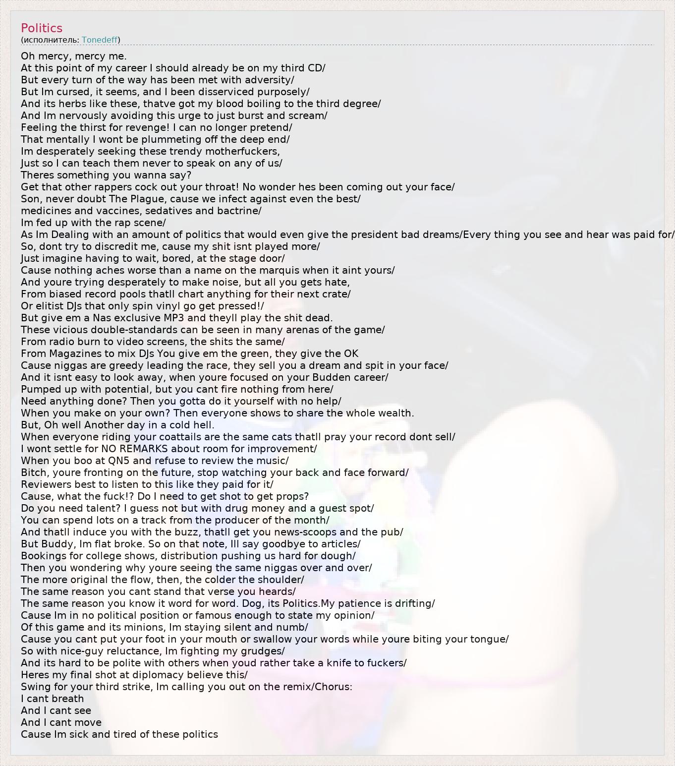 Oh mercy, mercy me. At this point of my career I should already be on my third CD/ But every turn of the way has been met with adversity/ But Im cursed, it seems, and I been disserviced purposely/ And its herbs like these, thatve got my blood boiling to the third degree/ And Im nervously avoiding this urge to just burst and scream/ Feeling the thirst for revenge! I can no longer pretend/ That mentally I wont be plummeting off the deep end/ Im desperately seeking these trendy motherfuckers, Just so I can teach them never to speak on any of us/ Theres something you wanna say? Get that other rappers cock out your throat! No wonder hes been coming out your face/ Son, never doubt The Plague, cause we infect against even the best/ medicines and vaccines, sedatives and bactrine/ Im fed up with the rap scene/ As Im Dealing with an amount of politics that would even give the president bad dreams/Every thing you see and hear was paid for/ So, dont try to discredit me, cause my shit isnt played more/ Just imagine having to wait, bored, at the stage door/ Cause nothing aches worse than a name on the marquis when it aint yours/ And youre trying desperately to make noise, but all you gets hate, From biased record pools thatll chart anything for their next crate/ Or elitist DJs that only spin vinyl go get pressed!/ But give em a Nas exclusive MP3 and theyll play the shit dead. These vicious double-standards can be seen in many arenas of the game/ From radio burn to video screens, the shits the same/ From Magazines to mix DJs You give em the green, they give the OK Cause niggas are greedy leading the race, they sell you a dream and spit in your face/ And it isnt easy to look away, when youre focused on your Budden career/ Pumped up with potential, but you cant fire nothing from here/ Need anything done? Then you gotta do it yourself with no help/ When you make on your own? Then everyone shows to share the whole wealth. But, Oh well Another day in a cold hell. When everyone riding your coattails are the same cats thatll pray your record dont sell/ I wont settle for NO REMARKS about room for improvement/ When you boo at QN5 and refuse to review the music/ Bitch, youre fronting on the future, stop watching your back and face forward/ Reviewers best to listen to this like they paid for it/ Cause, what the fuck!? Do I need to get shot to get props? Do you need talent? I guess not but with drug money and a guest spot/ You can spend lots on a track from the producer of the month/ And thatll induce you with the buzz, thatll get you news-scoops and the pub/ But Buddy, Im flat broke. So on that note, Ill say goodbye to articles/ Bookings for college shows, distribution pushing us hard for dough/ Then you wondering why youre seeing the same niggas over and over/ The more original the flow, then, the colder the shoulder/ The same reason you cant stand that verse you heards/ The same reason you know it word for word. Dog, its Politics.My patience is drifting/ Cause Im in no political position or famous enough to state my opinion/ Of this game and its minions, Im staying silent and numb/ Cause you cant put your foot in your mouth or swallow your words while youre biting your tongue/ So with nice-guy reluctance, Im fighting my grudges/ And its hard to be polite with others when youd rather take a knife to fuckers/ Heres my final shot at diplomacy believe this/ Swing for your third strike, Im calling you out on the remix/Chorus: I cant breath And I cant see And I cant move Cause Im sick and tired of these politics
