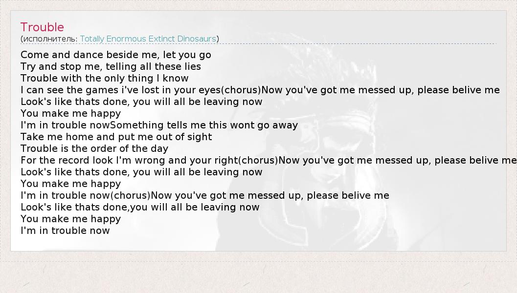 Это интересно:Totally Enormous Extinct Dinosaurs - это Орландо Хиггинботтом, сын оксфордского профессора, испытывающий одинаковый пиетет перед Бахом и классическим хаусом. Уже получил поддержку от Алекса Годдарда из Hot Chip и Леди Гаги, заказавшей ему ремикс. Критикует современную клубную культуру за апатичность. На концертах выступает в костюме бронтозавра.Его песни это ассамбляж примерно всей электронной музыки... продолжение