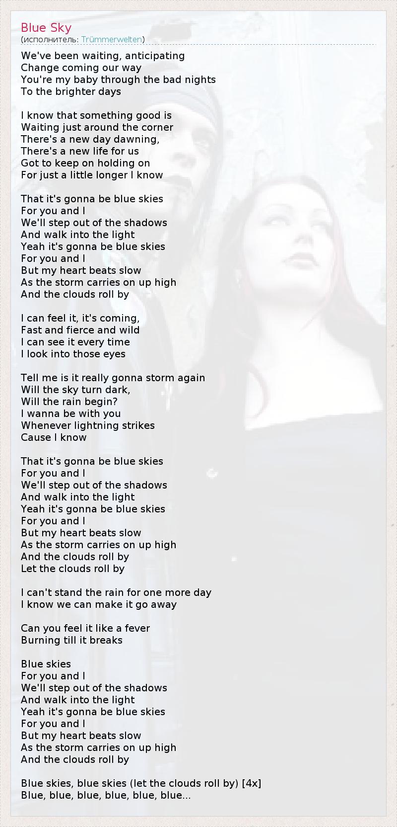 Мы ждём и надеемся, Что наступят перемены. Ты – моя любовь и тёмный ночью И светлым днём. Я знаю, что что-то хорошее Ждёт нас за углом. Начинается новый день, У нас впереди новая жизнь. Я знаю: нам нужно продержаться Ещё совсем немного. Нас ждут голубые небеса – Тебя и меня. Мы выйдем из тени И шагнём в лучи света. Да, нас ждут голубые небеса – Тебя и меня, Но мое сердце замирает, Когда в вышине бушует буря И надвигаются тучи. Я чувствую: она приближается: Быстрая, свирепая и дикая. Я всё время вижу её, Я заглядываю в её глаза. Скажи мне: неужели это снова буря? Неужели небо почернеет? Неужели начнётся дождь? Я хочу быть с тобой, Несмотря ни на какие молнии, Потому что я знаю: Нас ждут голубые небеса – Тебя и меня. Мы выйдем из тени И шагнём в лучи света. Да, нас ждут голубые небеса – Тебя и меня, Но мое сердце замирает, Когда в вышине бушует буря И надвигаются тучи. Пускай надвигаются тучи. Я не выдержу ещё день дождя. Я знаю: мы можем прогнать его. Ты чувствуешь? Это как лихорадка, Которая бушует, пока не утихнет. Голубые небеса – Для тебя и меня. Мы выйдем из тени И шагнём в лучи света. Да, нас ждут голубые небеса – Тебя и меня, Но мое сердце замирает, Когда в вышине бушует буря И надвигаются тучи. Голубые небеса, голубые небеса (пусть надвигаются тучи) [4x] Голубые, голубые, голубые, голубые...